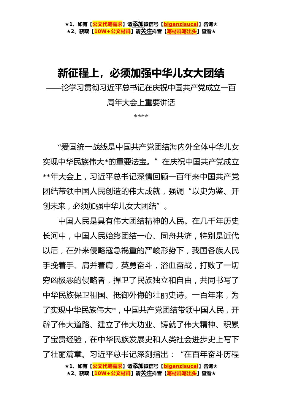 ★1、如有【公文代笔需求】请添加微信号【biganzisucai】咨询★★2、获取【10W+公文材料】请关注抖音【写材料写出头】查看★新征程上,必须加强中华儿女大团结——论学习贯彻习近平总书记在庆祝中国共产党成立一百周年大会上重要讲话****‍“爱国统一战线是中国共产党团结海内外全体中华儿女实现中华民族伟大*的重要法宝。”在庆祝中国共产党成立**年大会上,习近平总书记深情回顾一百年来中国共产党团结带领中国人民创造的伟大成就,强调“以史为鉴、开创未来,必须加强中华儿女大团结”。‍中国人民是具有伟大团结精神的人民。在几千年历史长河中,中国人民始终团结一心、同舟共济,特别是近代以后,在外来侵略寇急祸重的严峻形势下,我国各族人民手挽着手、肩并着肩,英勇奋斗,浴血奋战,打败了一切穷凶极恶的...