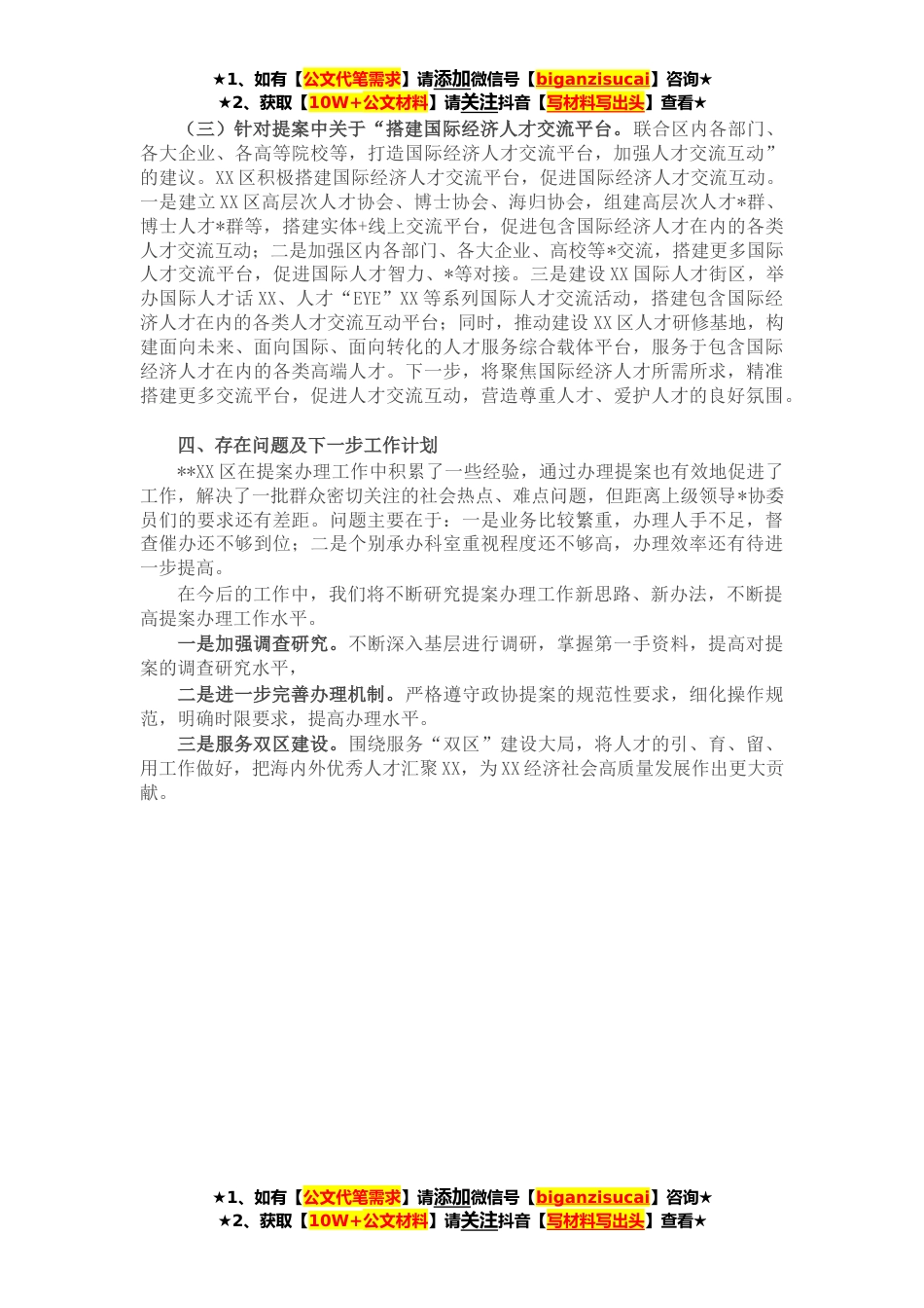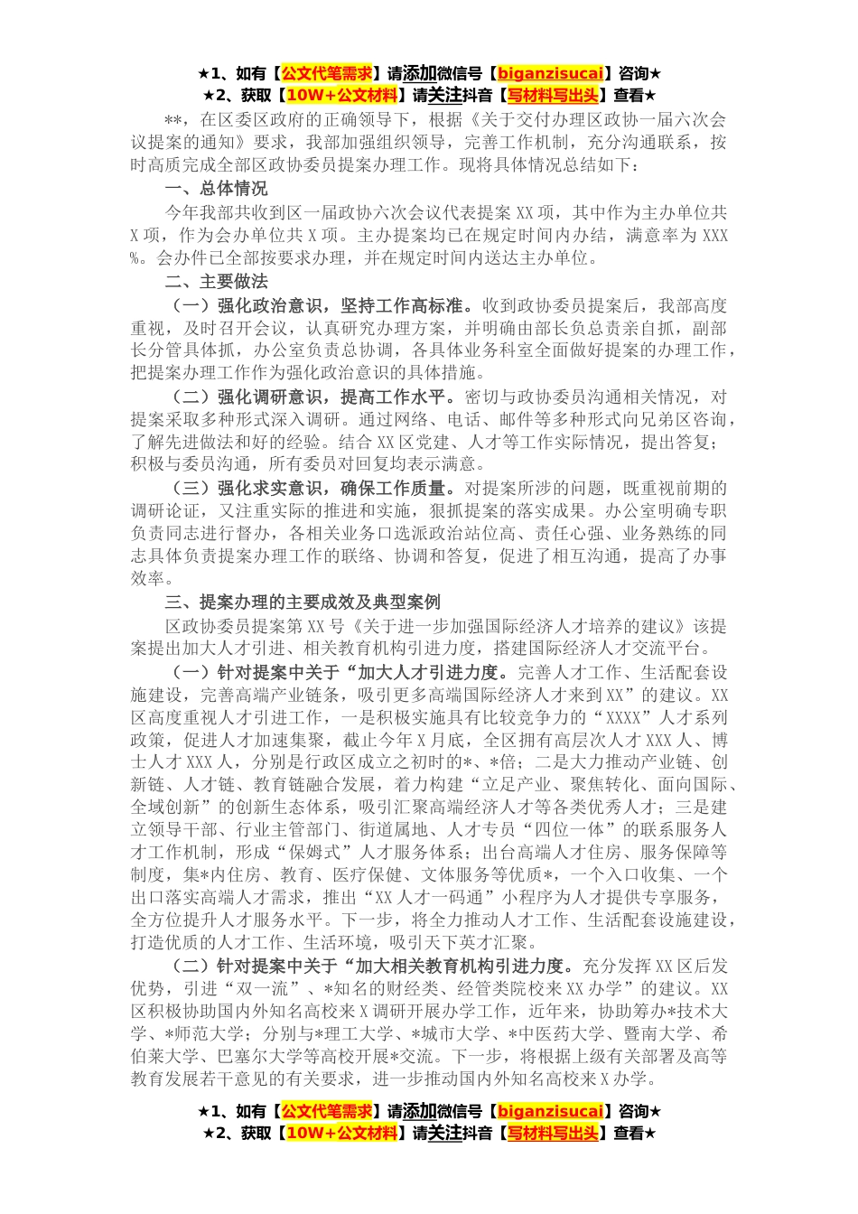 ★1、如有【公文代笔需求】请添加微信号【biganzisucai】咨询★★2、获取【10W+公文材料】请关注抖音【写材料写出头】查看★**,在区委区政府的正确领导下,根据《关于交付办理区政协一届六次会议提案的通知》要求,我部加强组织领导,完善工作机制,充分沟通联系,按时高质完成全部区政协委员提案办理工作。现将具体情况总结如下:一、总体情况今年我部共收到区一届政协六次会议代表提案XX项,其中作为主办单位共X项,作为会办单位共X项。主办提案均已在规定时间内办结,满意率为XXX%。会办件已全部按要求办理,并在规定时间内送达主办单位。二、主要做法(一)强化政治意识,坚持工作高标准。收到政协委员提案后,我部高度重视,及时召开会议,认真研究办理方案,并明确由部长负总责亲自抓,副部长分管具体抓,...