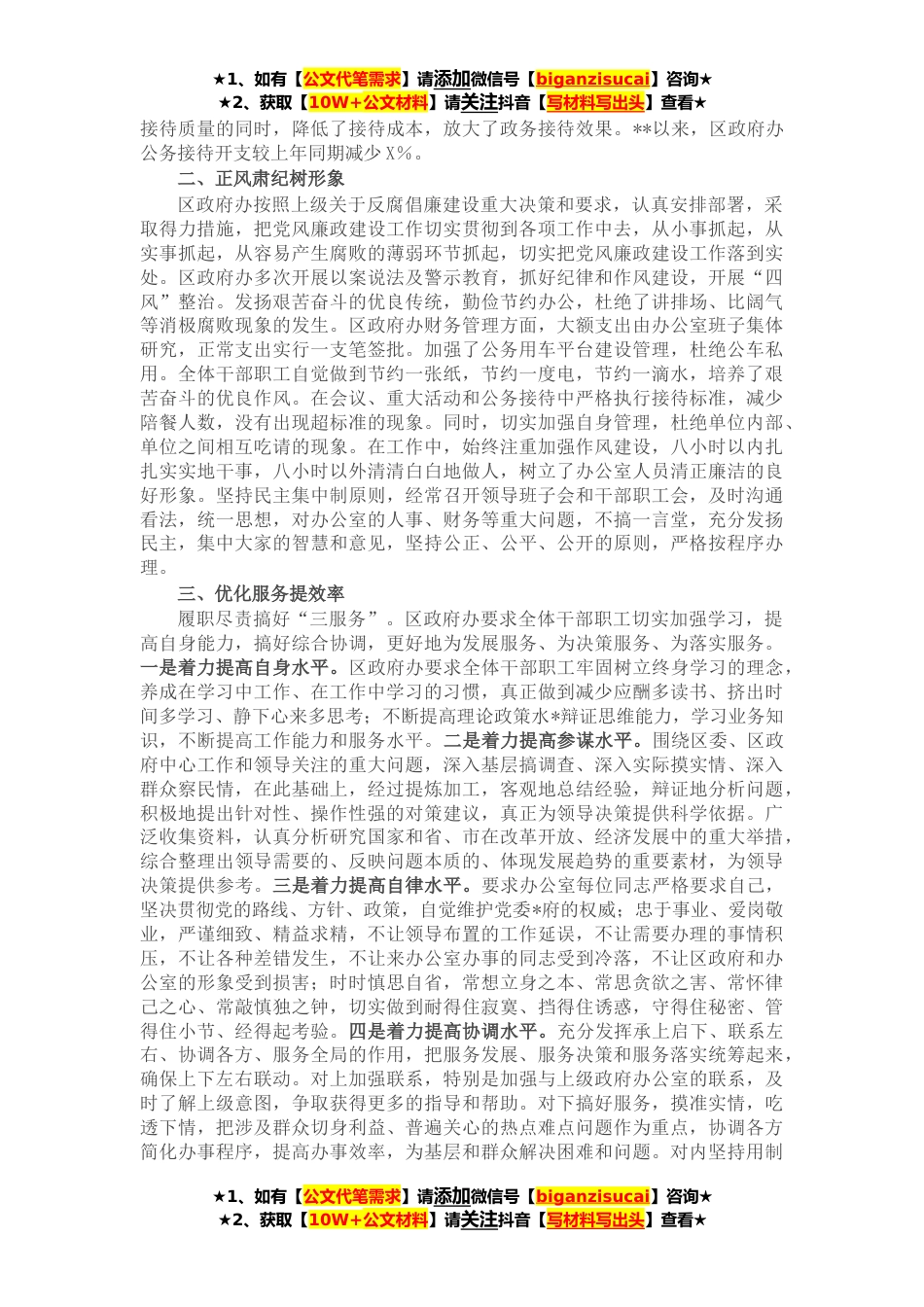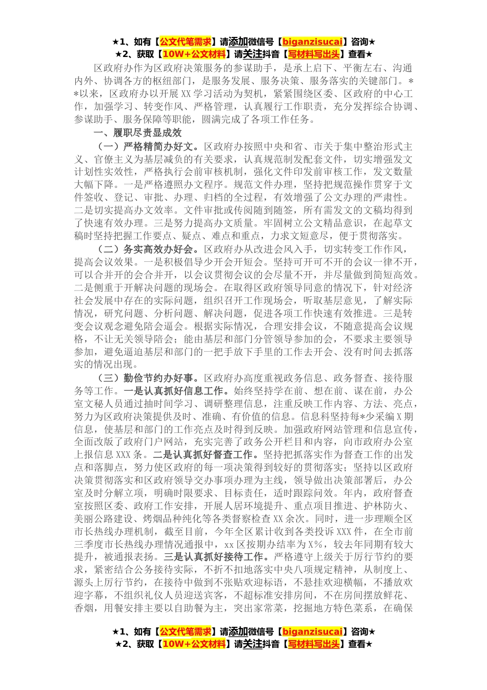 ★1、如有【公文代笔需求】请添加微信号【biganzisucai】咨询★★2、获取【10W+公文材料】请关注抖音【写材料写出头】查看★区政府办作为区政府决策服务的参谋助手,是承上启下、平衡左右、沟通内外、协调各方的枢纽部门,是服务发展、服务决策、服务落实的关键部门。**以来,区政府办以开展XX学习活动为契机,紧紧围绕区委、区政府的中心工作,加强学习、转变作风、严格管理,认真履行工作职责,充分发挥综合协调、参谋助手、服务保障等职能,圆满完成了各项工作任务。一、履职尽责显成效(一)严格精简办好文。区政府办按照中央和省、市关于集中整治形式主义、官僚主义为基层减负的有关要求,认真规范制发配套文件,切实增强发文计划性实效性,严格执行会前审核机制,强化文件印发前审核工作,发文数量大幅下降...