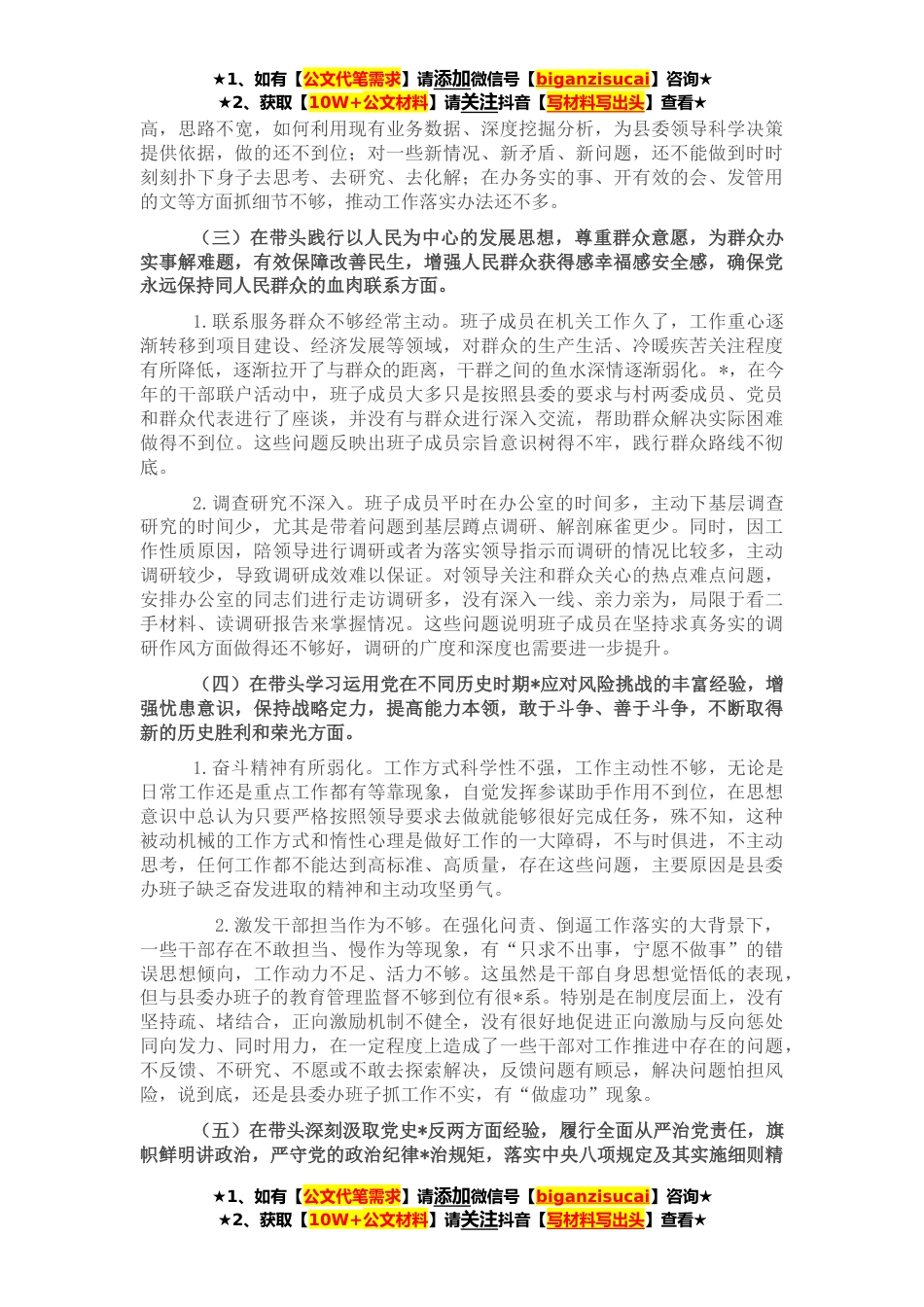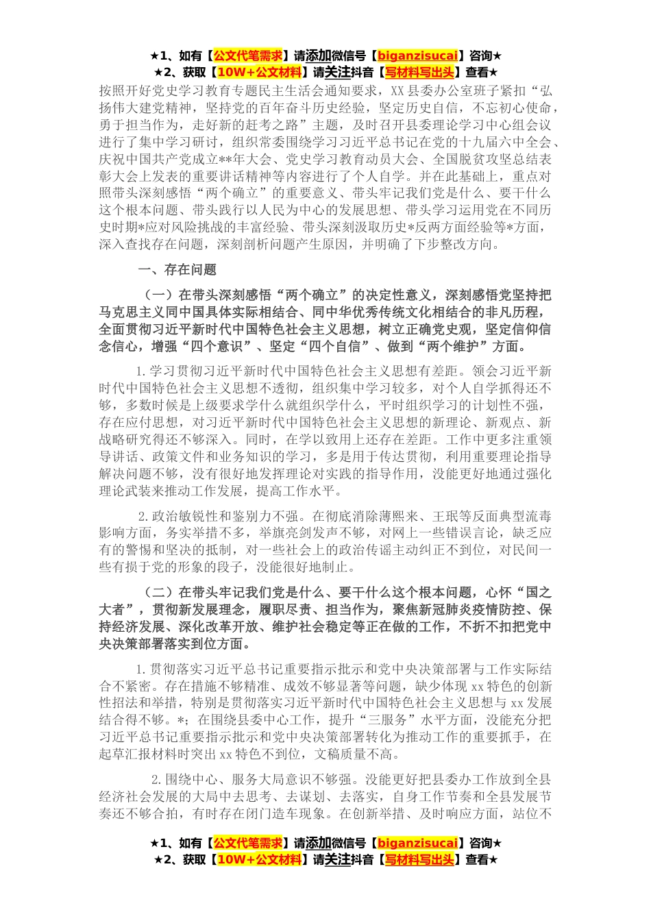 ★1、如有【公文代笔需求】请添加微信号【biganzisucai】咨询★★2、获取【10W+公文材料】请关注抖音【写材料写出头】查看★按照开好党史学习教育专题民主生活会通知要求,XX县委办公室班子紧扣“弘扬伟大建党精神,坚持党的百年奋斗历史经验,坚定历史自信,不忘初心使命,勇于担当作为,走好新的赶考之路”主题,及时召开县委理论学习中心组会议进行了集中学习研讨,组织常委围绕学习习近平总书记在党的十九届六中全会、庆祝中国共产党成立**年大会、党史学习教育动员大会、全国脱贫攻坚总结表彰大会上发表的重要讲话精神等内容进行了个人自学。并在此基础上,重点对照带头深刻感悟“两个确立”的重要意义、带头牢记我们党是什么、要干什么这个根本问题、带头践行以人民为中心的发展思想、带头学习运用党在不同...