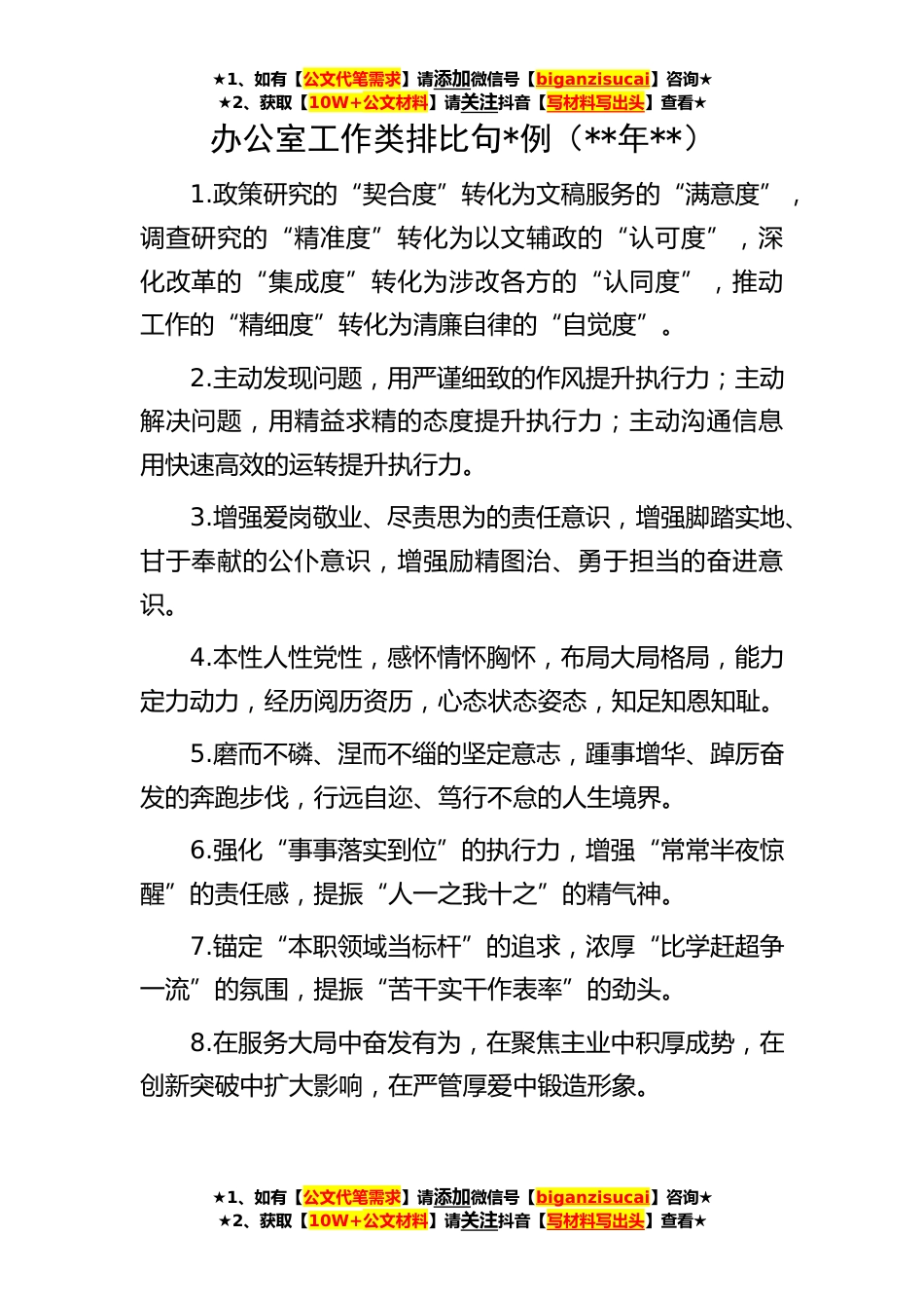 ★1、如有【公文代笔需求】请添加微信号【biganzisucai】咨询★★2、获取【10W+公文材料】请关注抖音【写材料写出头】查看★★1、如有【公文代笔需求】请添加微信号【biganzisucai】咨询★★2、获取【10W+公文材料】请关注抖音【写材料写出头】查看★★1、如有【公文代笔需求】请添加微信号【biganzisucai】咨询★★2、获取【10W+公文材料】请关注抖音【写材料写出头】查看★办公室工作类排比句*例(**年**)1.政策研究的“契合度”转化为文稿服务的“满意度”,调查研究的“精准度”转化为以文辅政的“认可度”,深化改革的“集成度”转化为涉改各方的“认同度”,推动工作的“精细度”转化为清廉自律的“自觉度”。2.主动发现问题,用严谨细致的作风提升执行力;主动解决问题,用精益求精的态度提升执行力;主动...