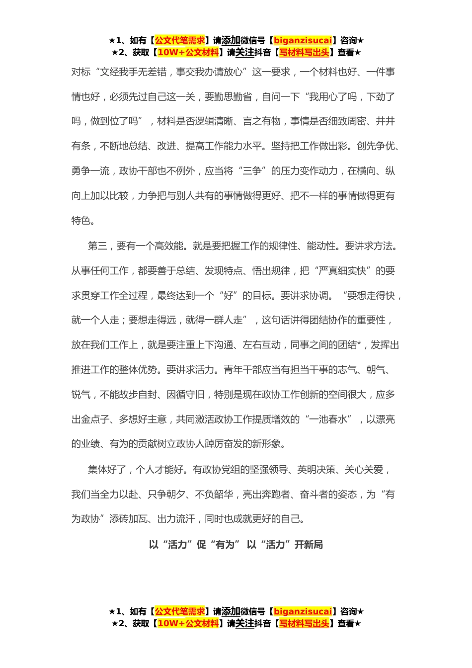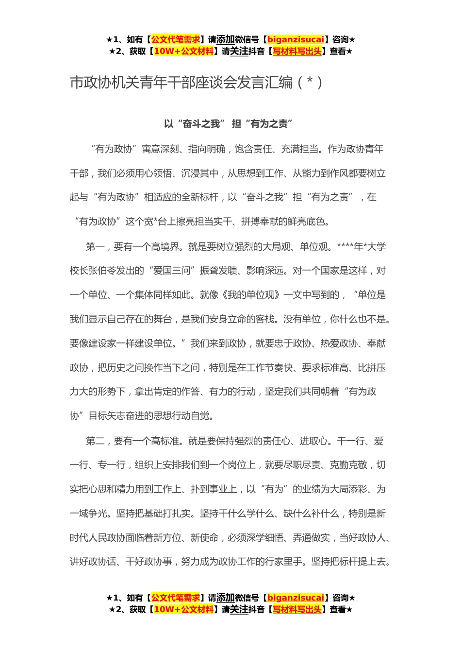 ★1、如有【公文代笔需求】请添加微信号【biganzisucai】咨询★★2、获取【10W+公文材料】请关注抖音【写材料写出头】查看★市政协机关青年干部座谈会发言汇编(*)以“奋斗之我”担“有为之责”“有为政协”寓意深刻、指向明确,饱含责任、充满担当。作为政协青年干部,我们必须用心领悟、沉浸其中,从思想到工作、从能力到作风都要树立起与“有为政协”相适应的全新标杆,以“奋斗之我”担“有为之责”,在“有为政协”这个宽*台上擦亮担当实干、拼搏奉献的鲜亮底色。第一,要有一个高境界。就是要树立强烈的大局观、单位观。****年*大学校长张伯苓发出的“爱国三问”振聋发聩、影响深远。对一个国家是这样,对一个单位、一个集体同样如此。就像《我的单位观》一文中写到的,“单位是我们显示自己存在的舞台,是...