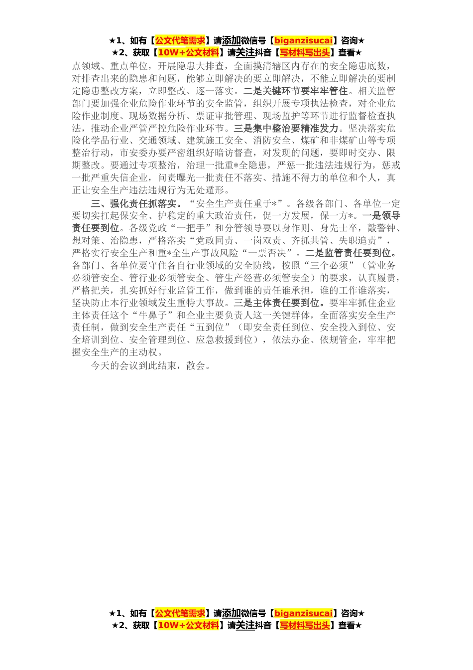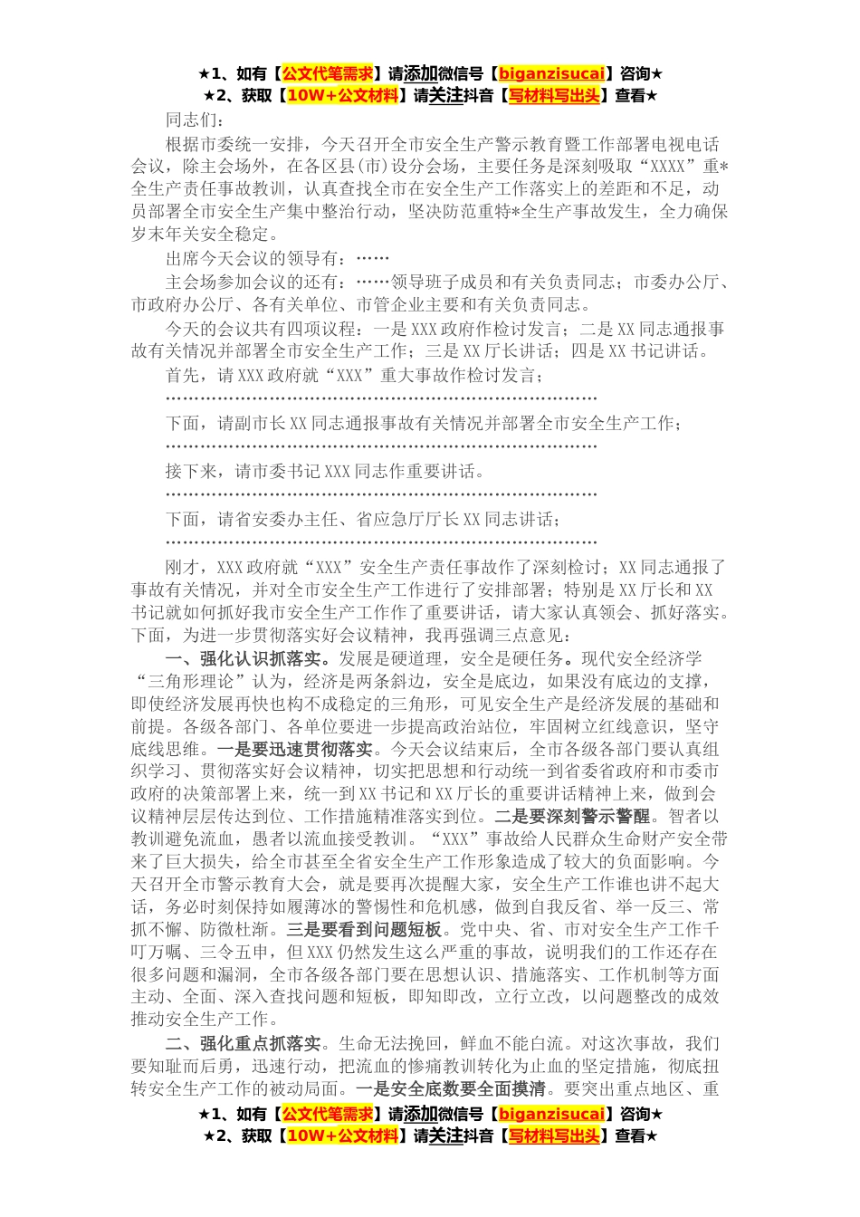 ★1、如有【公文代笔需求】请添加微信号【biganzisucai】咨询★★2、获取【10W+公文材料】请关注抖音【写材料写出头】查看★同志们:根据市委统一安排,今天召开全市安全生产警示教育暨工作部署电视电话会议,除主会场外,在各区县(市)设分会场,主要任务是深刻吸取“XXXX”重*全生产责任事故教训,认真查找全市在安全生产工作落实上的差距和不足,动员部署全市安全生产集中整治行动,坚决防范重特*全生产事故发生,全力确保岁末年关安全稳定。出席今天会议的领导有:……主会场参加会议的还有:……领导班子成员和有关负责同志;市委办公厅、市政府办公厅、各有关单位、市管企业主要和有关负责同志。今天的会议共有四项议程:一是XXX政府作检讨发言;二是XX同志通报事故有关情况并部署全市安全生产工作;三是XX厅...