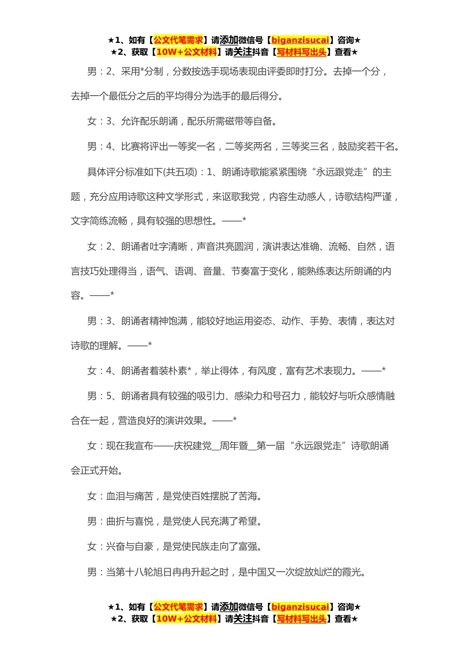 ★1、如有【公文代笔需求】请添加微信号【biganzisucai】咨询★★2、获取【10W+公文材料】请关注抖音【写材料写出头】查看★目录庆祝七一建党节联欢晚会主持词*1庆祝七一建党节联欢晚会主持词*4庆祝七一建党节联欢晚会主持词*5庆祝七一建党节联欢晚会主持词*6庆祝七一建党节联欢晚会主持词**庆祝七一建党节联欢晚会主持词*女:尊敬的各位领导、老师,男:亲爱的同学们:合:大家好!女:__年前的**,伟大的中国共产党诞生了。从此,中国发生了翻天覆地的变化。男:中国共产党领导中国人民_了三座大山,建立了社会主义的新中国,进行了卓越的社会主义现代化建设,取得了举世瞩目的成就。女:我们感谢党,拥护党。男:为了庆祝建党__周年,营造浓郁的校园文化氛围,丰富同学们的业余文化生活,激发广大学生的爱国热情...