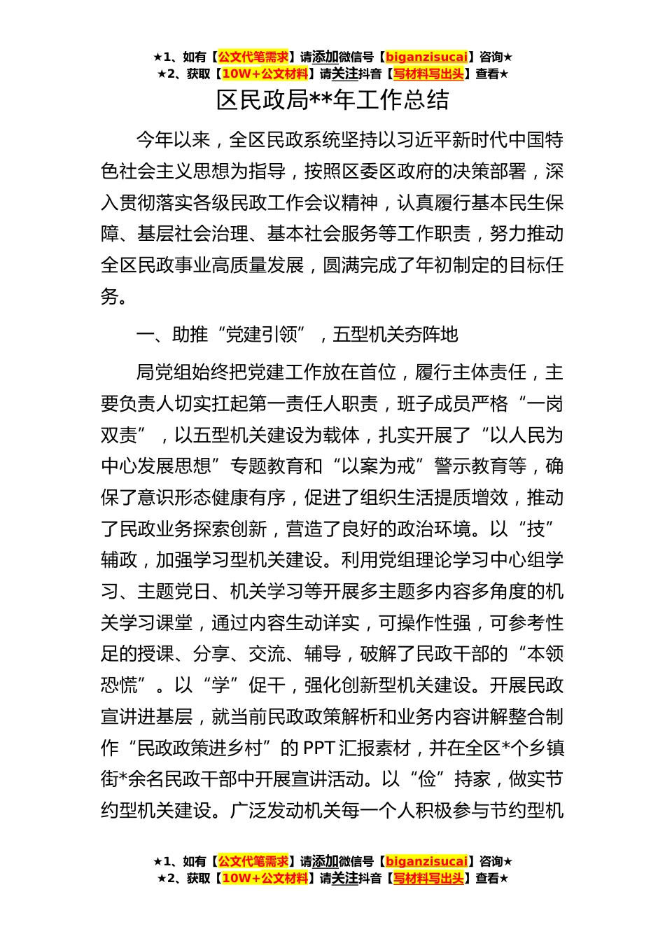 ★1、如有【公文代笔需求】请添加微信号【biganzisucai】咨询★★2、获取【10W+公文材料】请关注抖音【写材料写出头】查看★★1、如有【公文代笔需求】请添加微信号【biganzisucai】咨询★★2、获取【10W+公文材料】请关注抖音【写材料写出头】查看★★1、如有【公文代笔需求】请添加微信号【biganzisucai】咨询★★2、获取【10W+公文材料】请关注抖音【写材料写出头】查看★区民政局**年工作总结今年以来,全区民政系统坚持以习近平新时代中国特色社会主义思想为指导,按照区委区政府的决策部署,深入贯彻落实各级民政工作会议精神,认真履行基本民生保障、基层社会治理、基本社会服务等工作职责,努力推动全区民政事业高质量发展,圆满完成了年初制定的目标任务。一、助推“党建引领”,五型机关夯阵地局党组始...
