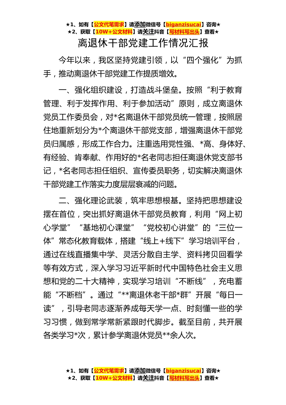 ★1、如有【公文代笔需求】请添加微信号【biganzisucai】咨询★★2、获取【10W+公文材料】请关注抖音【写材料写出头】查看★★1、如有【公文代笔需求】请添加微信号【biganzisucai】咨询★★2、获取【10W+公文材料】请关注抖音【写材料写出头】查看★★1、如有【公文代笔需求】请添加微信号【biganzisucai】咨询★★2、获取【10W+公文材料】请关注抖音【写材料写出头】查看★离退休干部党建工作情况汇报今年以来,我区坚持党建引领,以“四个强化”为抓手,推动离退休干部党建工作提质增效。一、强化组织建设,打造战斗堡垒。按照“利于教育管理、利于发挥作用、利于参加活动”原则,成立离退休党员工作委员会,对*名离退休干部党员统一管理,按照居住地重新划分为*个离退休干部党支部,增强离退休干部党员归属感...