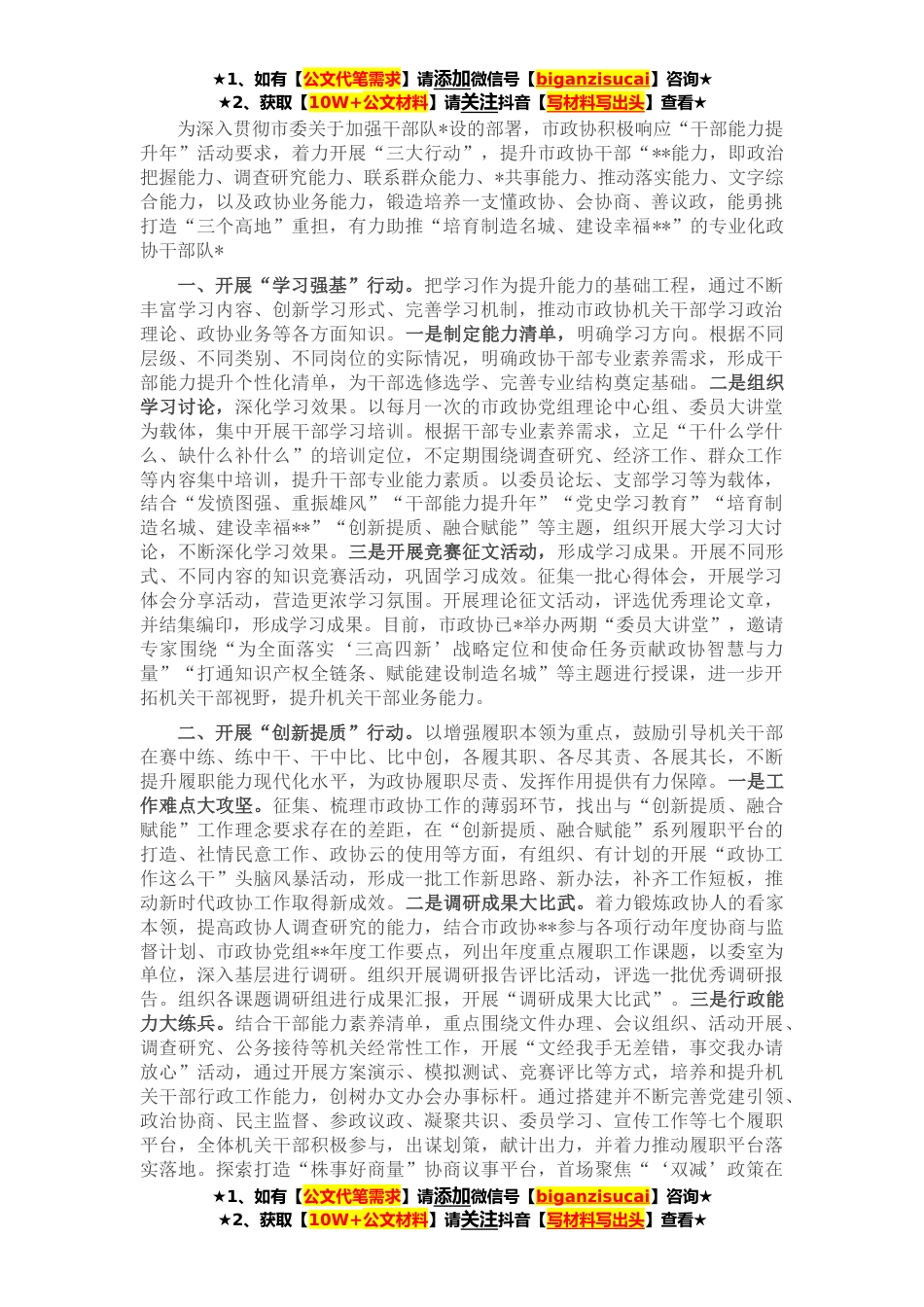 ★1、如有【公文代笔需求】请添加微信号【biganzisucai】咨询★★2、获取【10W+公文材料】请关注抖音【写材料写出头】查看★为深入贯彻市委关于加强干部队*设的部署,市政协积极响应“干部能力提升年”活动要求,着力开展“三大行动”,提升市政协干部“**能力,即政治把握能力、调查研究能力、联系群众能力、*共事能力、推动落实能力、文字综合能力,以及政协业务能力,锻造培养一支懂政协、会协商、善议政,能勇挑打造“三个高地”重担,有力助推“培育制造名城、建设幸福**”的专业化政协干部队*一、开展“学习强基”行动。把学习作为提升能力的基础工程,通过不断丰富学习内容、创新学习形式、完善学习机制,推动市政协机关干部学习政治理论、政协业务等各方面知识。一是制定能力清单,明确学习方向。根据不同...