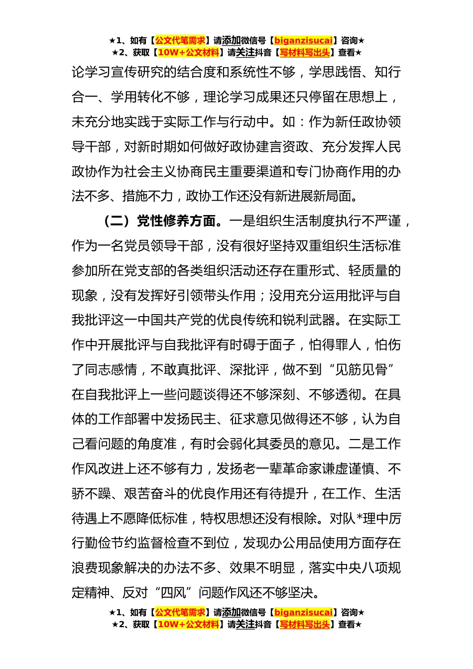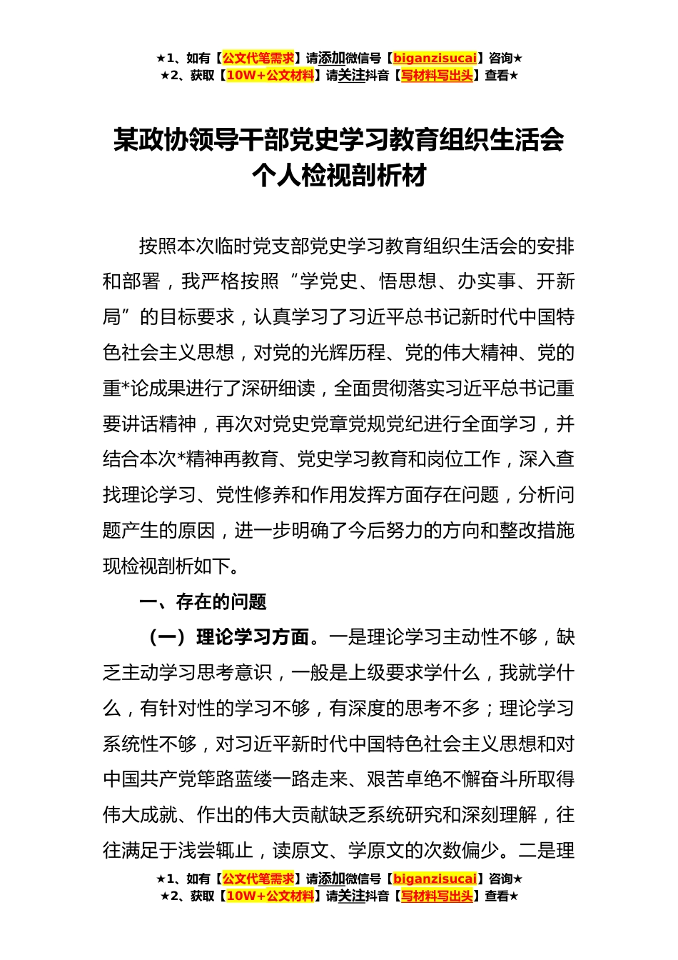 ★1、如有【公文代笔需求】请添加微信号【biganzisucai】咨询★★2、获取【10W+公文材料】请关注抖音【写材料写出头】查看★某政协领导干部党史学习教育组织生活会个人检视剖析材按照本次临时党支部党史学习教育组织生活会的安排和部署,我严格按照“学党史、悟思想、办实事、开新局”的目标要求,认真学习了习近平总书记新时代中国特色社会主义思想,对党的光辉历程、党的伟大精神、党的重*论成果进行了深研细读,全面贯彻落实习近平总书记重要讲话精神,再次对党史党章党规党纪进行全面学习,并结合本次*精神再教育、党史学习教育和岗位工作,深入查找理论学习、党性修养和作用发挥方面存在问题,分析问题产生的原因,进一步明确了今后努力的方向和整改措施现检视剖析如下。一、存在的问题(一)理论学习方面。...