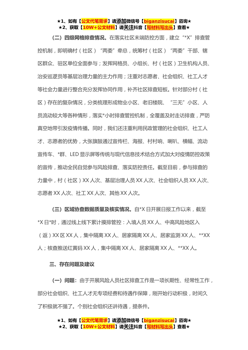★1、如有【公文代笔需求】请添加微信号【biganzisucai】咨询★★2、获取【10W+公文材料】请关注抖音【写材料写出头】查看★尊敬的XXX:按照会议安排,现就XX区新冠肺炎疫情风险人员社区排查工作开展情况作一简要汇报。一、体系构建情况自疫情防控工作开展以来,XX区成立了新冠肺炎疫情防控工作领导小组及应急指挥部,指挥部下设X个工作组,其中,由区委政法委牵头的社会层面管控组,牵头负责疫情风险人员排查工作。区民政局重点抓好本行业、系统特别是养老、殡葬机构、婚姻登记机关的疫情防控工作。*X日,全省民政系统新冠肺炎疫情风险人员社区排查工作调度会议召开后,区民政局及时向区委、区政府及区应急指挥部汇报。区政府及时调整工作力量,在社会层面管控组基础上,成立了XX区新冠肺炎疫情风险人员社区排查...