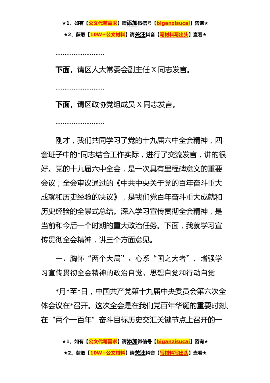 ★1、如有【公文代笔需求】请添加微信号【biganzisucai】咨询★★2、获取【10W+公文材料】请关注抖音【写材料写出头】查看★区委书记在学习传达十九届六中全会精神大会上的主持讲话同志们:今天,我们召开区委常委会扩大会议,主要任务是传达学习党的十九届六中全会精神,安排部署我区学习贯彻工作,动员全区上下切实用全会精神统一思想、凝聚力量、指导实践、推动发展,努力开创各项工作新局面。首先,请X区长领学党的十九届六中全会公报。...........................下面,围绕学习贯彻党的十九届六中全会精神交流发言。...........................首先,请区委副书记X同志发言;...........................下面,请区委常委、宣传部长X同志发言;...........................下面,请区委常委、常务副区长X...