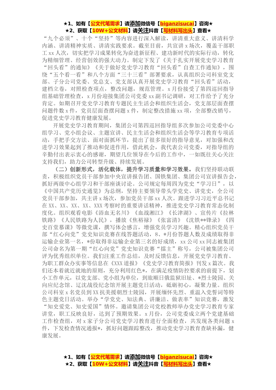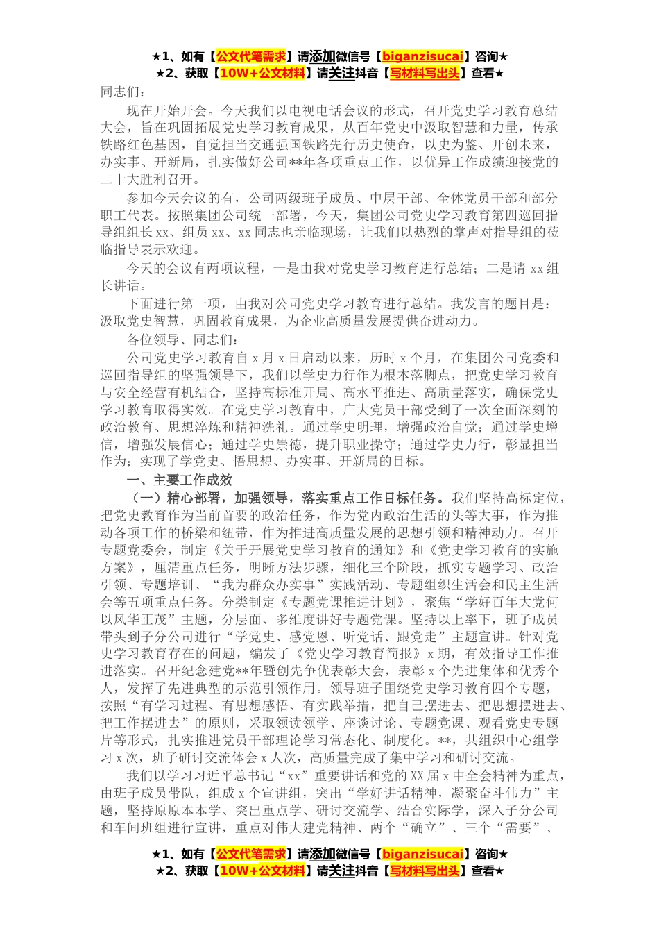 ★1、如有【公文代笔需求】请添加微信号【biganzisucai】咨询★★2、获取【10W+公文材料】请关注抖音【写材料写出头】查看★同志们:现在开始开会。今天我们以电视电话会议的形式,召开党史学习教育总结大会,旨在巩固拓展党史学习教育成果,从百年党史中汲取智慧和力量,传承铁路红色基因,自觉担当交通强国铁路先行历史使命,以史为鉴、开创未来,办实事、开新局,扎实做好公司**年各项重点工作,以优异工作成绩迎接党的二十大胜利召开。参加今天会议的有,公司两级班子成员、中层干部、全体党员干部和部分职工代表。按照集团公司统一部署,今天,集团公司党史学习教育第四巡回指导组组长xx、组员xx、xx同志也亲临现场,让我们以热烈的掌声对指导组的莅临指导表示欢迎。今天的会议有两项议程,一是由我对党史学...