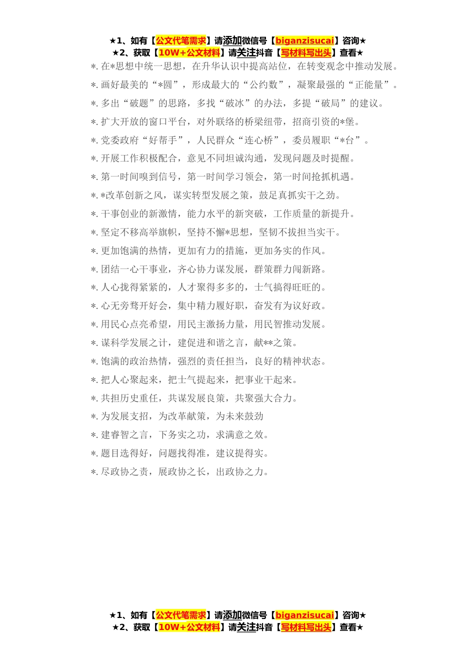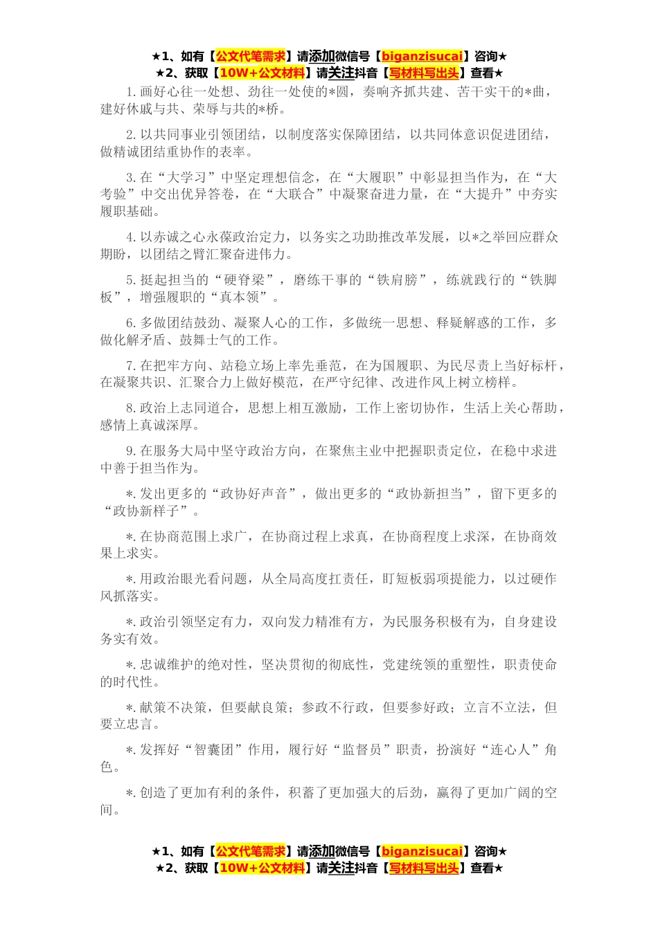 ★1、如有【公文代笔需求】请添加微信号【biganzisucai】咨询★★2、获取【10W+公文材料】请关注抖音【写材料写出头】查看★1.画好心往一处想、劲往一处使的*圆,奏响齐抓共建、苦干实干的*曲,建好休戚与共、荣辱与共的*桥。2.以共同事业引领团结,以制度落实保障团结,以共同体意识促进团结,做精诚团结重协作的表率。3.在“大学习”中坚定理想信念,在“大履职”中彰显担当作为,在“大考验”中交出优异答卷,在“大联合”中凝聚奋进力量,在“大提升”中夯实履职基础。4.以赤诚之心永葆政治定力,以务实之功助推改革发展,以*之举回应群众期盼,以团结之臂汇聚奋进伟力。5.挺起担当的“硬脊梁”,磨练干事的“铁肩膀”,练就践行的“铁脚板”,增强履职的“真本领”。6.多做团结鼓劲、凝聚人心的工作,多做统...