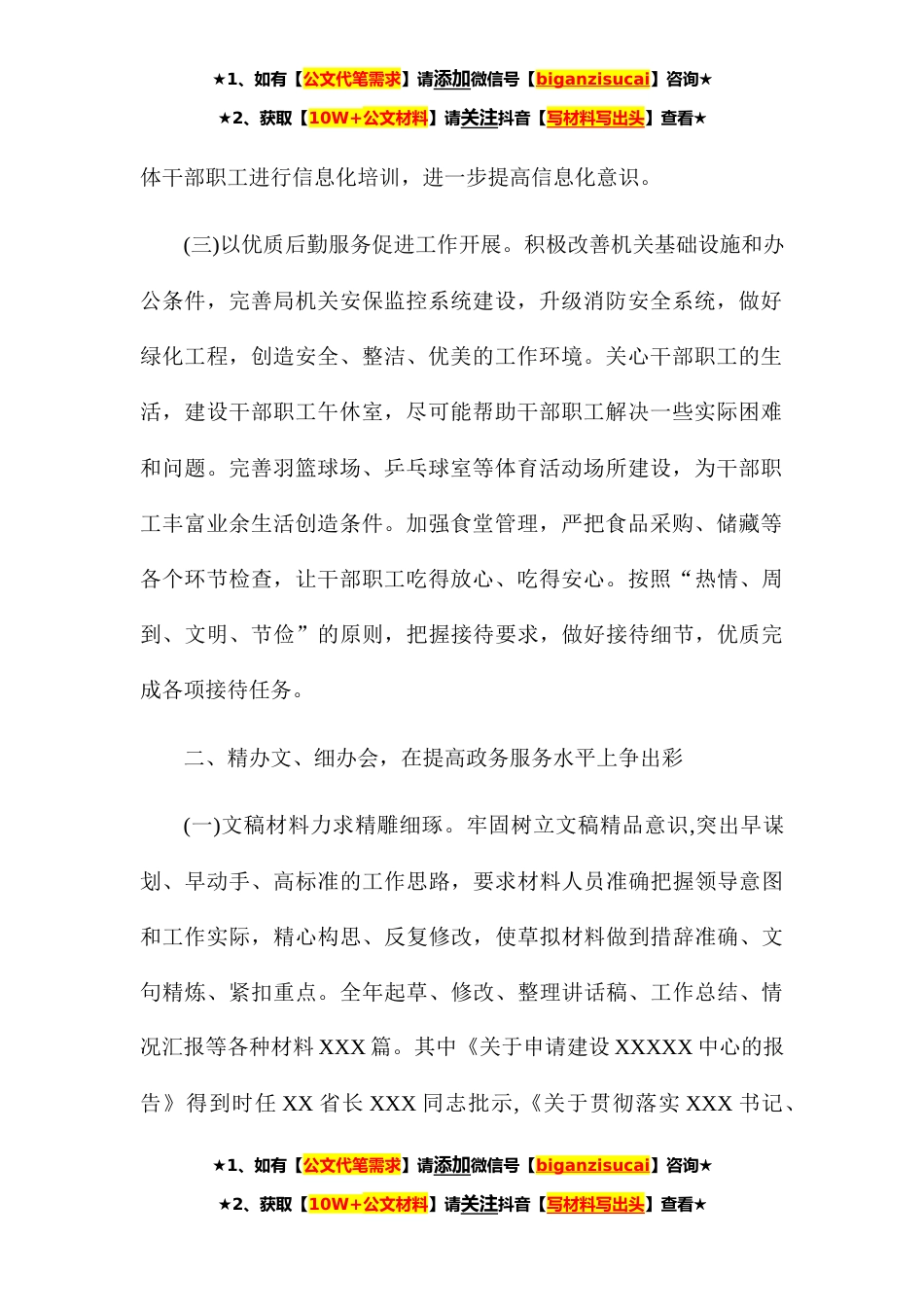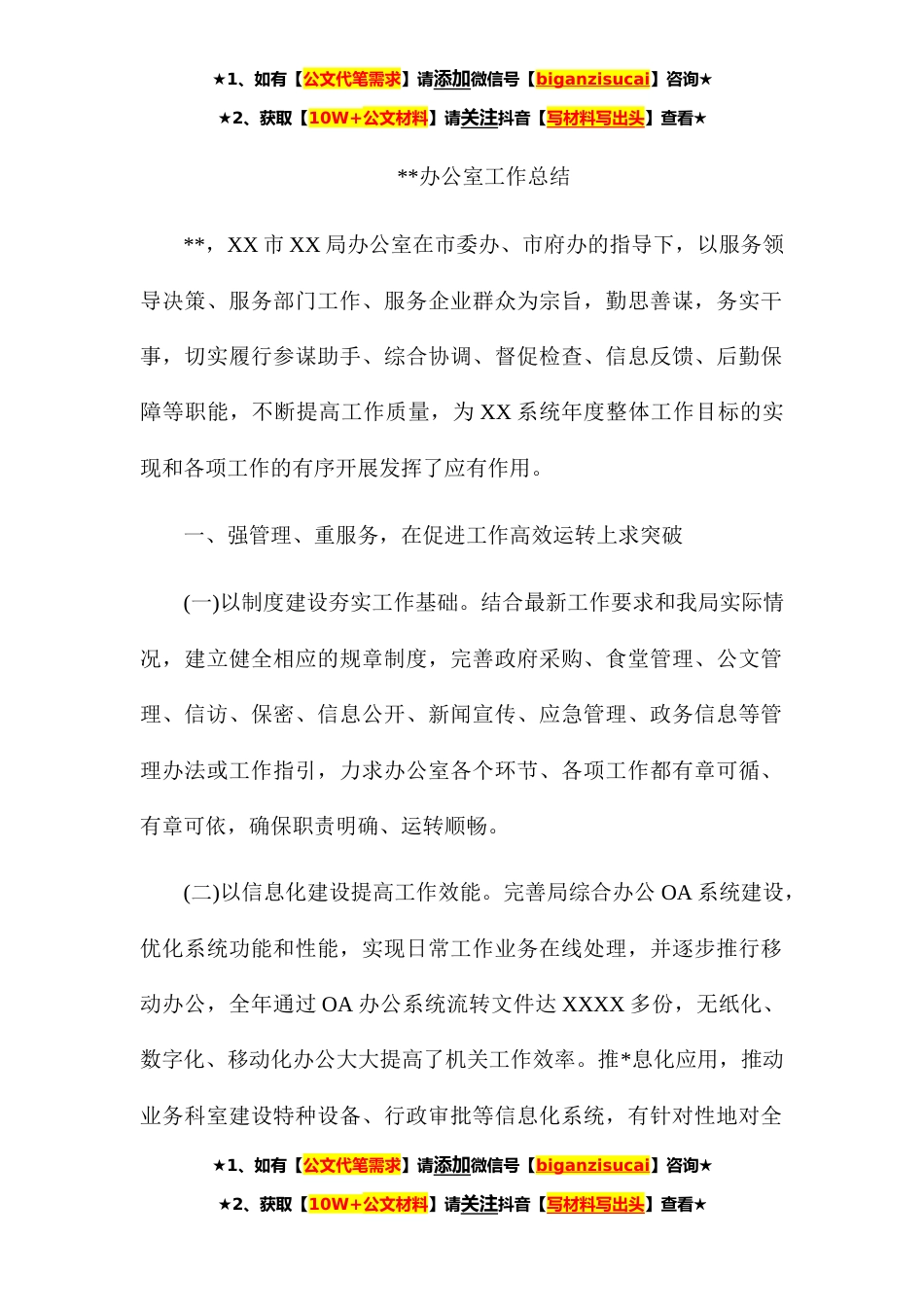 ★1、如有【公文代笔需求】请添加微信号【biganzisucai】咨询★★2、获取【10W+公文材料】请关注抖音【写材料写出头】查看★**办公室工作总结**,XX市XX局办公室在市委办、市府办的指导下,以服务领导决策、服务部门工作、服务企业群众为宗旨,勤思善谋,务实干事,切实履行参谋助手、综合协调、督促检查、信息反馈、后勤保障等职能,不断提高工作质量,为XX系统年度整体工作目标的实现和各项工作的有序开展发挥了应有作用。一、强管理、重服务,在促进工作高效运转上求突破(一)以制度建设夯实工作基础。结合最新工作要求和我局实际情况,建立健全相应的规章制度,完善政府采购、食堂管理、公文管理、信访、保密、信息公开、新闻宣传、应急管理、政务信息等管理办法或工作指引,力求办公室各个环节、各项工作都有...