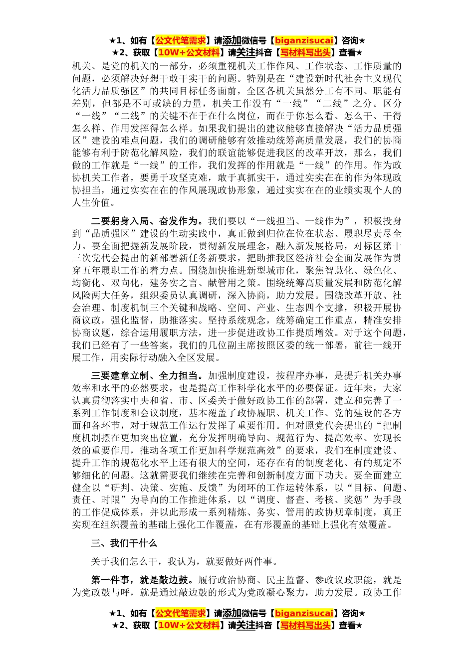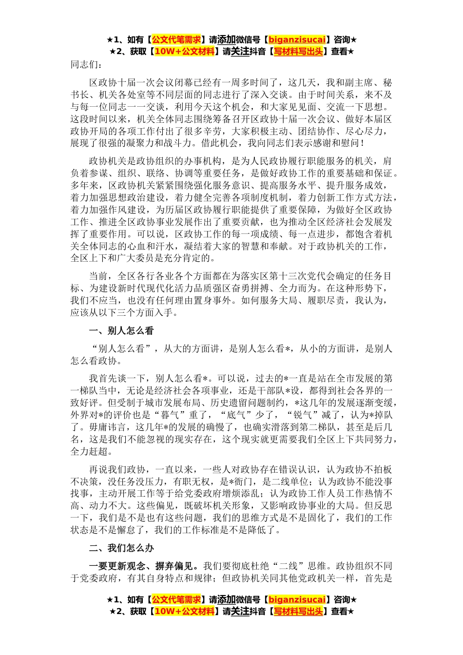 ★1、如有【公文代笔需求】请添加微信号【biganzisucai】咨询★★2、获取【10W+公文材料】请关注抖音【写材料写出头】查看★同志们:区政协十届一次会议闭幕已经有一周多时间了,这几天,我和副主席、秘书长、机关各处室等不同层面的同志进行了深入交谈。由于时间关系,来不及与每一位同志一一交谈,利用今天这个机会,和大家见见面、交流一下思想。这段时间以来,机关全体同志围绕筹备召开区政协十届一次会议、做好本届区政协开局的各项工作付出了很多辛劳,大家积极主动、团结协作、尽心尽力,展现了很强的凝聚力和战斗力。借此机会,我向同志们表示感谢和慰问!政协机关是政协组织的办事机构,是为人民政协履行职能服务的机关,肩负着参谋、组织、联络、协调等重要任务,是做好政协工作的重要基础和保证。多年...