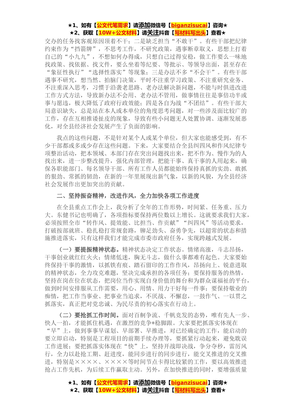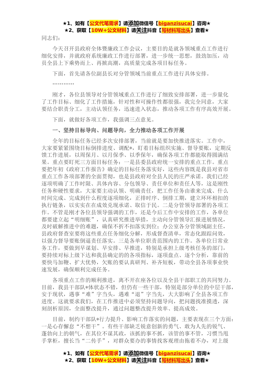 ★1、如有【公文代笔需求】请添加微信号【biganzisucai】咨询★★2、获取【10W+公文材料】请关注抖音【写材料写出头】查看★同志们:今天召开县政府全体暨廉政工作会议,主要目的是就各领域重点工作进行细化安排,并就政府系统廉政工作进行部署,进一步统一思想,鼓劲加压,动员全县上下乘势而上、再掀高潮,高质量完成各项目标任务。下面,首先请各位副县长对分管领域当前重点工作进行具体安排。…………刚才,各位县领导对分管领域重点工作进行了细致安排部署,进一步量化了工作目标、细化了工作措施,针对性和可操作性都很强,我完全同意,大家要结合职责分工,主动认领任务,迅速进入状态,推动各项工作有序高效开展。下面,就做好各项工作,我强调三点意见。一、坚持目标导向、问题导向,全力推动各项工作开...