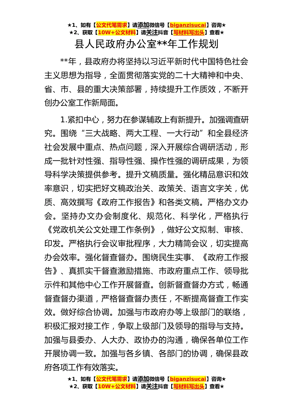 ★1、如有【公文代笔需求】请添加微信号【biganzisucai】咨询★★2、获取【10W+公文材料】请关注抖音【写材料写出头】查看★★1、如有【公文代笔需求】请添加微信号【biganzisucai】咨询★★2、获取【10W+公文材料】请关注抖音【写材料写出头】查看★★1、如有【公文代笔需求】请添加微信号【biganzisucai】咨询★★2、获取【10W+公文材料】请关注抖音【写材料写出头】查看★县人民政府办公室**年工作规划**年,县政府办将坚持以习近平新时代中国特色社会主义思想为指导,全面贯彻落实党的二十大精神和中央、省、市、县的重大决策部署,持续提升工作质效,不断开创办公室工作新局面。1.紧扣中心,努力在参谋辅政上有新提升。加强调查研究。围绕“三大战略、两大工程、一大行动”和全县经济社会发展中重点、热点问...