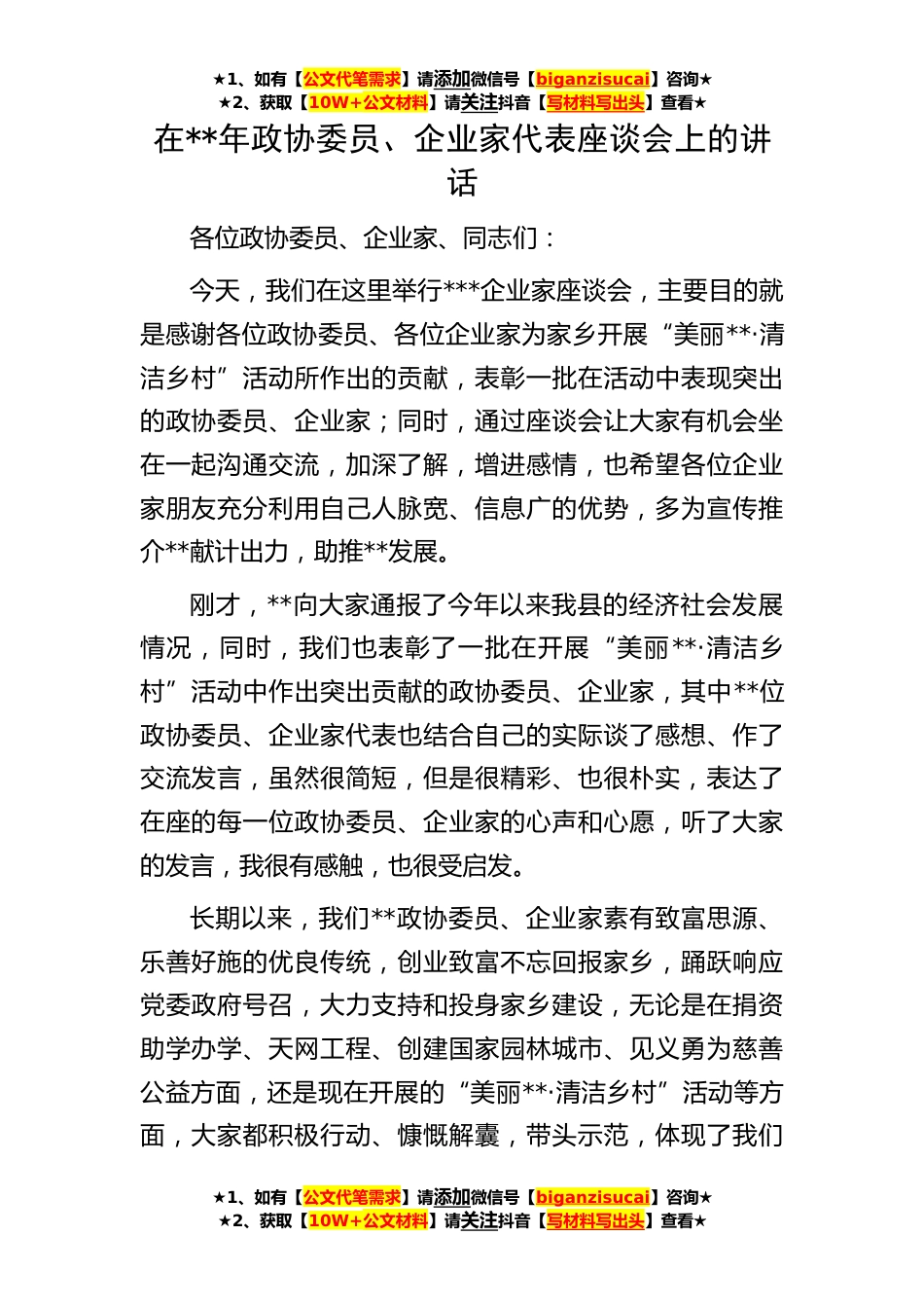 ★1、如有【公文代笔需求】请添加微信号【biganzisucai】咨询★★2、获取【10W+公文材料】请关注抖音【写材料写出头】查看★★1、如有【公文代笔需求】请添加微信号【biganzisucai】咨询★★2、获取【10W+公文材料】请关注抖音【写材料写出头】查看★★1、如有【公文代笔需求】请添加微信号【biganzisucai】咨询★★2、获取【10W+公文材料】请关注抖音【写材料写出头】查看★在**年政协委员、企业家代表座谈会上的讲话各位政协委员、企业家、同志们:今天,我们在这里举行***企业家座谈会,主要目的就是感谢各位政协委员、各位企业家为家乡开展“美丽**·清洁乡村”活动所作出的贡献,表彰一批在活动中表现突出的政协委员、企业家;同时,通过座谈会让大家有机会坐在一起沟通交流,加深了解,增进感情,也希望各位...