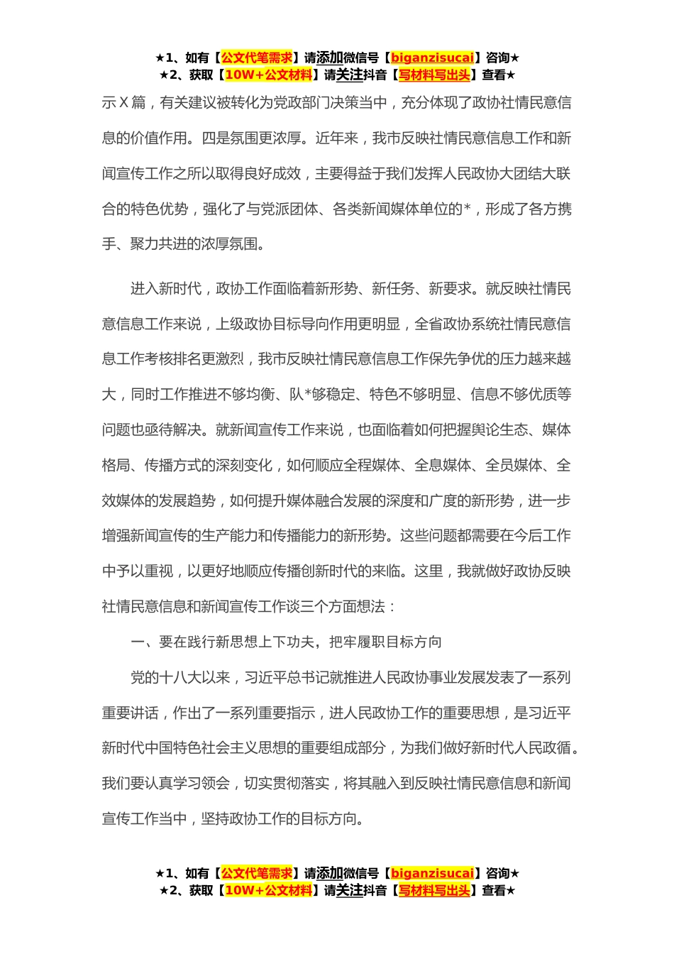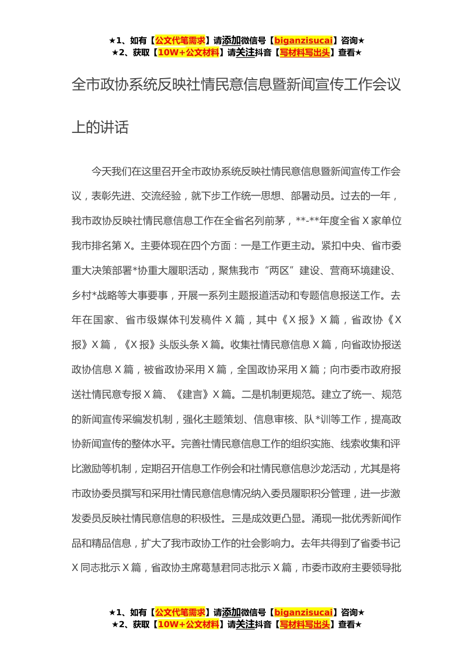 ★1、如有【公文代笔需求】请添加微信号【biganzisucai】咨询★★2、获取【10W+公文材料】请关注抖音【写材料写出头】查看★全市政协系统反映社情民意信息暨新闻宣传工作会议上的讲话今天我们在这里召开全市政协系统反映社情民意信息暨新闻宣传工作会议,表彰先进、交流经验,就下步工作统一思想、部暑动员。过去的一年,我市政协反映社情民意信息工作在全省名列前茅,**-**年度全省X家单位我市排名第X。主要体现在四个方面:一是工作更主动。紧扣中央、省市委重大决策部署*协重大履职活动,聚焦我市“两区”建设、营商环境建设、乡村*战略等大事要事,开展一系列主题报道活动和专题信息报送工作。去年在国家、省市级媒体刊发稿件X篇,其中《X报》X篇,省政协《X报》X篇,《X报》头版头条X篇。收集社情民意信息X篇...