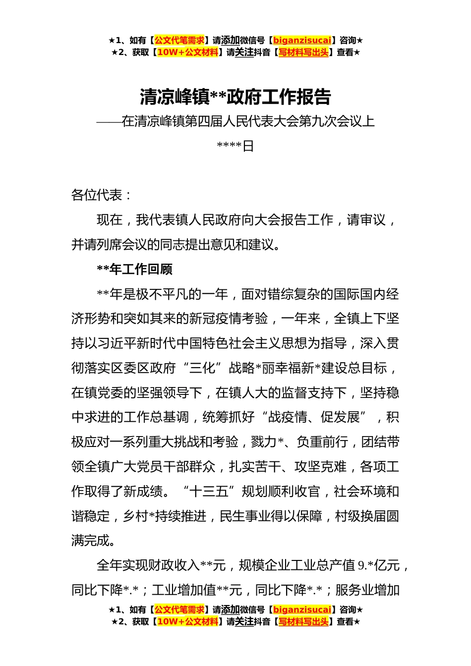 ★1、如有【公文代笔需求】请添加微信号【biganzisucai】咨询★★2、获取【10W+公文材料】请关注抖音【写材料写出头】查看★清凉峰镇**政府工作报告——在清凉峰镇第四届人民代表大会第九次会议上****日各位代表:现在,我代表镇人民政府向大会报告工作,请审议,并请列席会议的同志提出意见和建议。**年工作回顾**年是极不平凡的一年,面对错综复杂的国际国内经济形势和突如其来的新冠疫情考验,一年来,全镇上下坚持以习近平新时代中国特色社会主义思想为指导,深入贯彻落实区委区政府“三化”战略*丽幸福新*建设总目标,在镇党委的坚强领导下,在镇人大的监督支持下,坚持稳中求进的工作总基调,统筹抓好“战疫情、促发展”,积极应对一系列重大挑战和考验,戮力*、负重前行,团结带领全镇广大党员干部群众,扎...