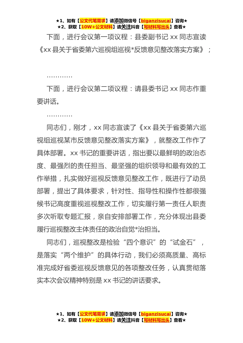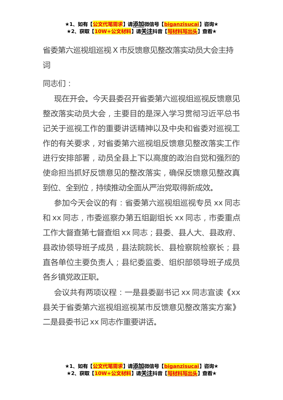 ★1、如有【公文代笔需求】请添加微信号【biganzisucai】咨询★★2、获取【10W+公文材料】请关注抖音【写材料写出头】查看★省委第六巡视组巡视X市反馈意见整改落实动员大会主持词同志们:现在开会。今天县委召开省委第六巡视组巡视反馈意见整改落实动员大会,主要目的是深入学习贯彻习近平总书记关于巡视工作的重要讲话精神以及中央和省委对巡视工作的有关要求,对省委第六巡视组反馈意见整改落实工作进行安排部署,动员全县上下以高度的政治自觉和强烈的使命担当抓好反馈意见的整改落实,确保反馈意见整改真到位、全到位,持续推动全面从严治党取得新成效。参加今天会议的有:省委第六巡视组巡视专员xx同志和xx同志,市委巡察办第五组副组长xx同志,市委重点工作大督查第七督查组xx同志;县委、县人大、县政府、...