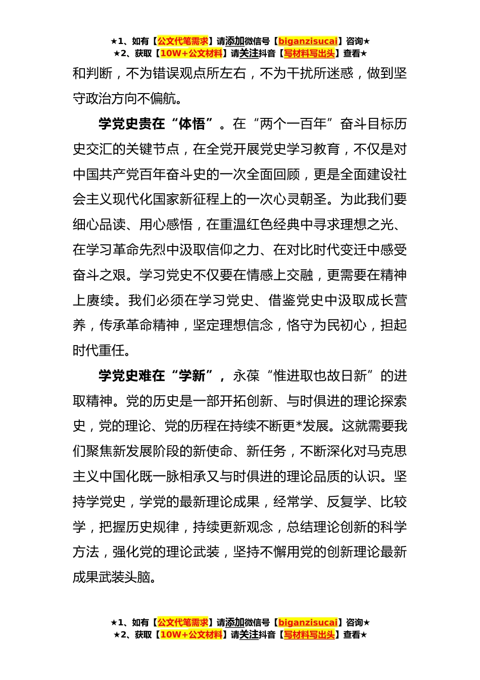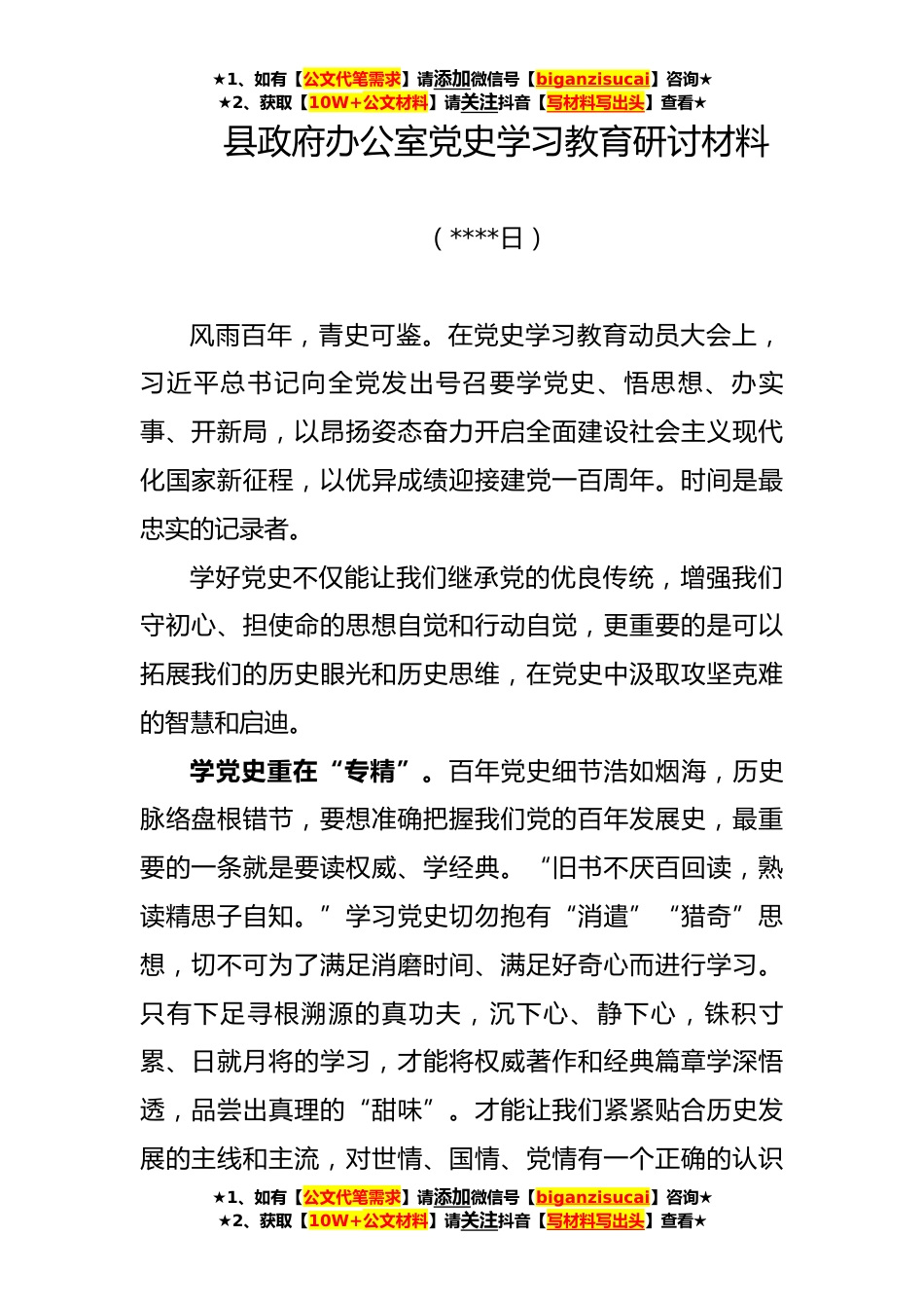 ★1、如有【公文代笔需求】请添加微信号【biganzisucai】咨询★★2、获取【10W+公文材料】请关注抖音【写材料写出头】查看★县政府办公室党史学习教育研讨材料(****日)风雨百年,青史可鉴。在党史学习教育动员大会上,习近平总书记向全党发出号召要学党史、悟思想、办实事、开新局,以昂扬姿态奋力开启全面建设社会主义现代化国家新征程,以优异成绩迎接建党一百周年。时间是最忠实的记录者。学好党史不仅能让我们继承党的优良传统,增强我们守初心、担使命的思想自觉和行动自觉,更重要的是可以拓展我们的历史眼光和历史思维,在党史中汲取攻坚克难的智慧和启迪。学党史重在“专精”。百年党史细节浩如烟海,历史脉络盘根错节,要想准确把握我们党的百年发展史,最重要的一条就是要读权威、学经典。“旧书不厌...