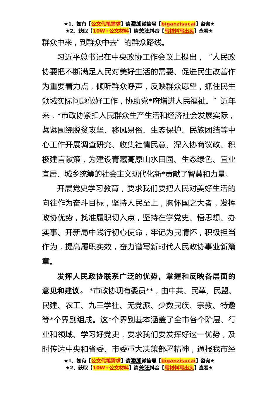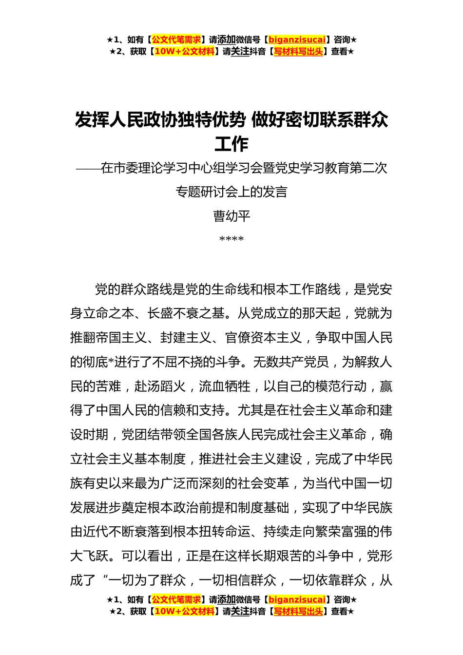★1、如有【公文代笔需求】请添加微信号【biganzisucai】咨询★★2、获取【10W+公文材料】请关注抖音【写材料写出头】查看★发挥人民政协独特优势做好密切联系群众工作——在市委理论学习中心组学习会暨党史学习教育第二次专题研讨会上的发言曹幼平****党的群众路线是党的生命线和根本工作路线,是党安身立命之本、长盛不衰之基。从党成立的那天起,党就为推翻帝国主义、封建主义、官僚资本主义,争取中国人民的彻底*进行了不屈不挠的斗争。无数共产党员,为解救人民的苦难,赴汤蹈火,流血牺牲,以自己的模范行动,赢得了中国人民的信赖和支持。尤其是在社会主义革命和建设时期,党团结带领全国各族人民完成社会主义革命,确立社会主义基本制度,推进社会主义建设,完成了中华民族有史以来最为广泛而深刻的社会变...
