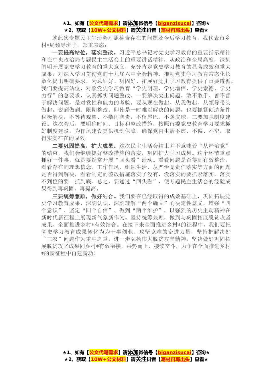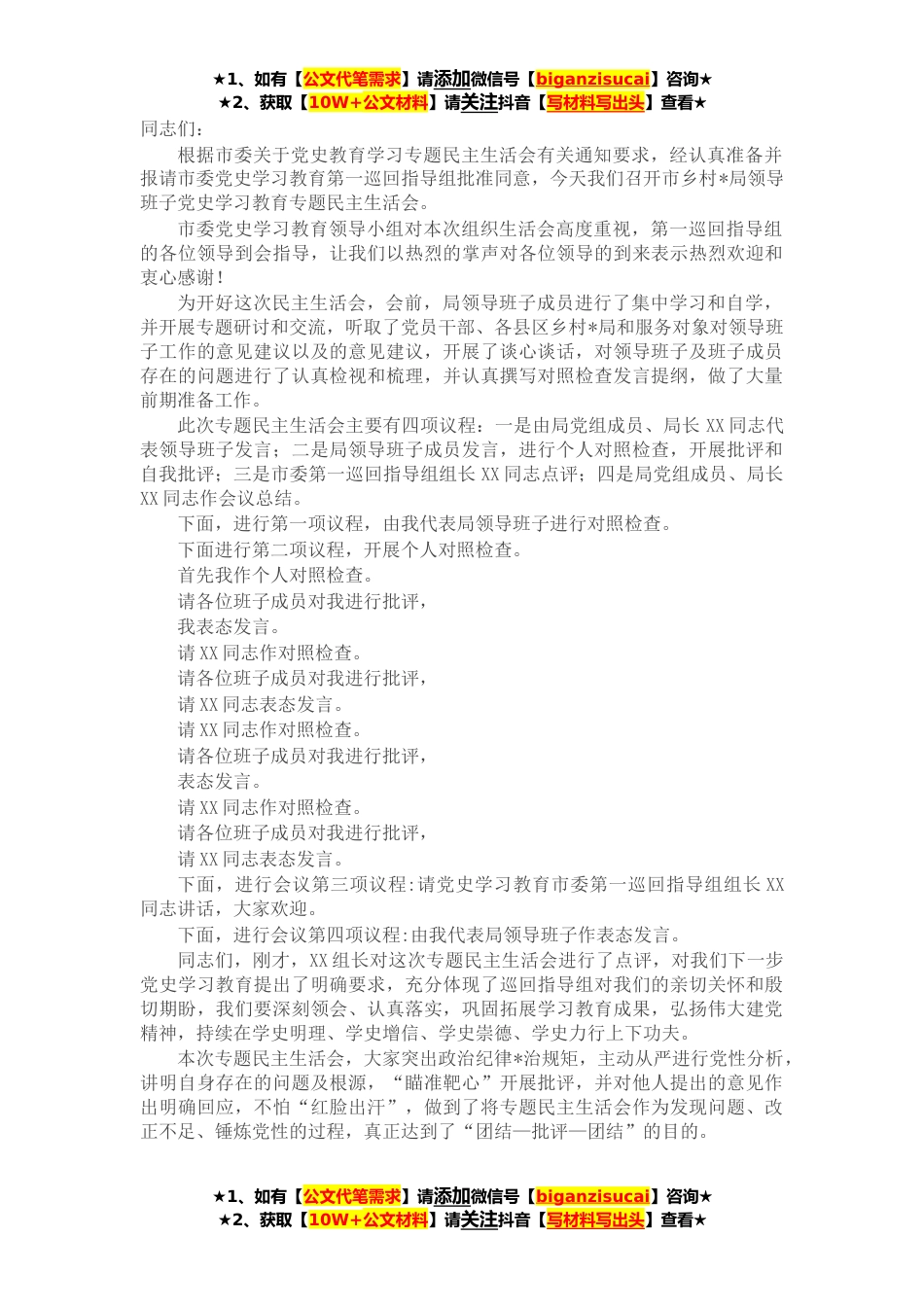 ★1、如有【公文代笔需求】请添加微信号【biganzisucai】咨询★★2、获取【10W+公文材料】请关注抖音【写材料写出头】查看★同志们:根据市委关于党史教育学习专题民主生活会有关通知要求,经认真准备并报请市委党史学习教育第一巡回指导组批准同意,今天我们召开市乡村*局领导班子党史学习教育专题民主生活会。市委党史学习教育领导小组对本次组织生活会高度重视,第一巡回指导组的各位领导到会指导,让我们以热烈的掌声对各位领导的到来表示热烈欢迎和衷心感谢!为开好这次民主生活会,会前,局领导班子成员进行了集中学习和自学,并开展专题研讨和交流,听取了党员干部、各县区乡村*局和服务对象对领导班子工作的意见建议以及的意见建议,开展了谈心谈话,对领导班子及班子成员存在的问题进行了认真检视和梳理...