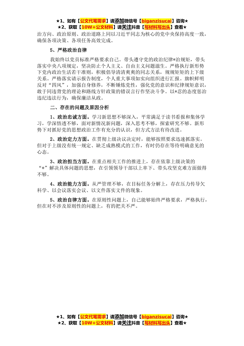 ★1、如有【公文代笔需求】请添加微信号【biganzisucai】咨询★★2、获取【10W+公文材料】请关注抖音【写材料写出头】查看★一、“政治忠诚、政治定力、政治担当、政治能力、政治自律”五个方面情况1、铸牢政治忠诚我始终把“四个意识”“两个维护”作为立身之本。一是学习牢牢定神,通过学习,用科学理论武装头脑,来指导实践党的宗旨,实践党的目标和任务。二是身份牢牢定位,要强化身份意识,永远牢记、爱护、珍惜自己的“第一身份”,把党员身份视为崇高的政治荣誉、化为沉甸甸的重大责任、作为严格的约束尺度。三是品格牢牢定型,以“绝对忠诚”的品格修身做人,带头发扬“严”的精神和“实”的作风,始终对党高度信赖,时刻严守党的政治纪律*治规矩,自觉维护党的形象。四是宗旨牢牢定心,把为人民服务的宗...
