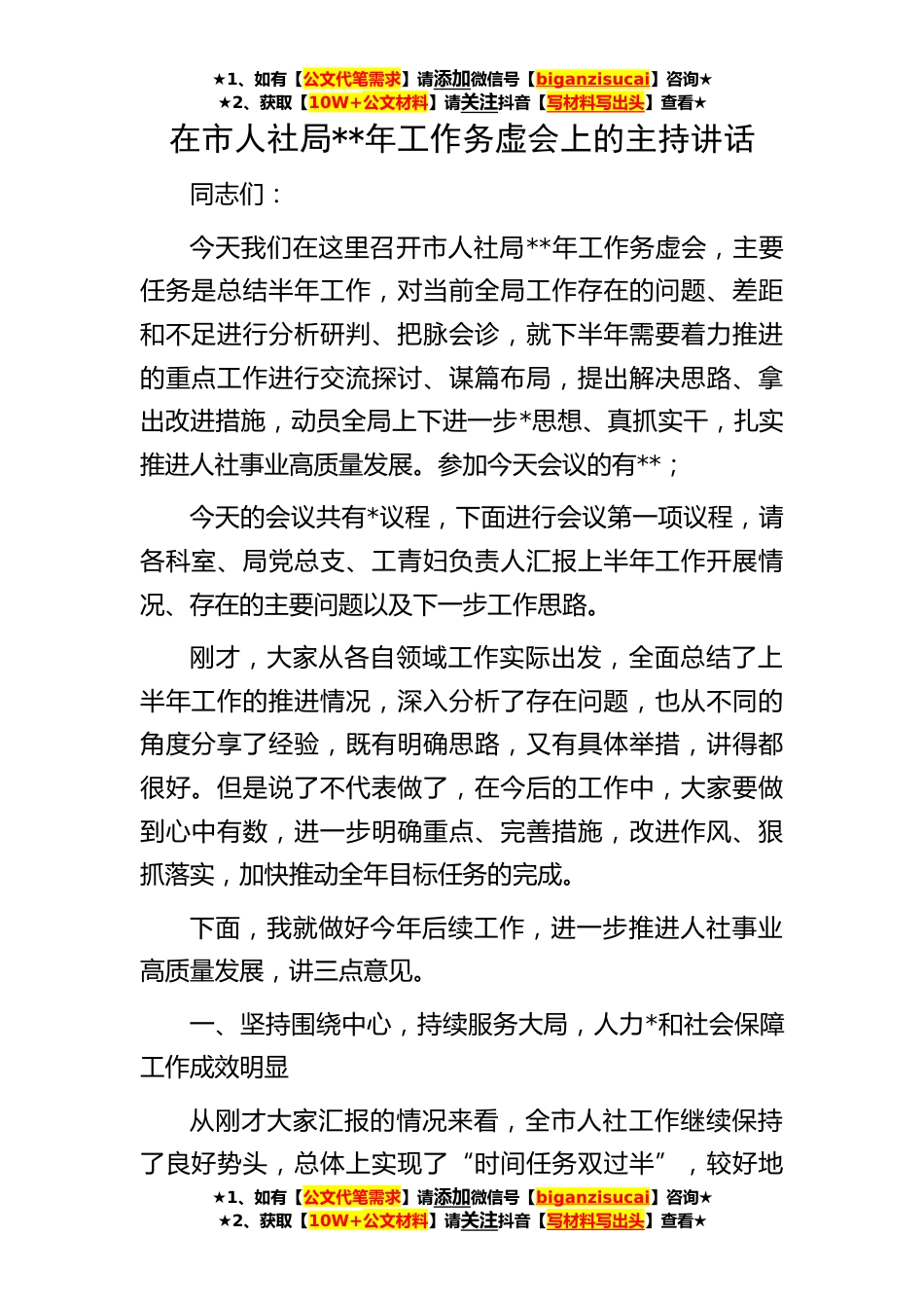 ★1、如有【公文代笔需求】请添加微信号【biganzisucai】咨询★★2、获取【10W+公文材料】请关注抖音【写材料写出头】查看★★1、如有【公文代笔需求】请添加微信号【biganzisucai】咨询★★2、获取【10W+公文材料】请关注抖音【写材料写出头】查看★★1、如有【公文代笔需求】请添加微信号【biganzisucai】咨询★★2、获取【10W+公文材料】请关注抖音【写材料写出头】查看★在市人社局**年工作务虚会上的主持讲话同志们:今天我们在这里召开市人社局**年工作务虚会,主要任务是总结半年工作,对当前全局工作存在的问题、差距和不足进行分析研判、把脉会诊,就下半年需要着力推进的重点工作进行交流探讨、谋篇布局,提出解决思路、拿出改进措施,动员全局上下进一步*思想、真抓实干,扎实推进人社事业高质量发展。...