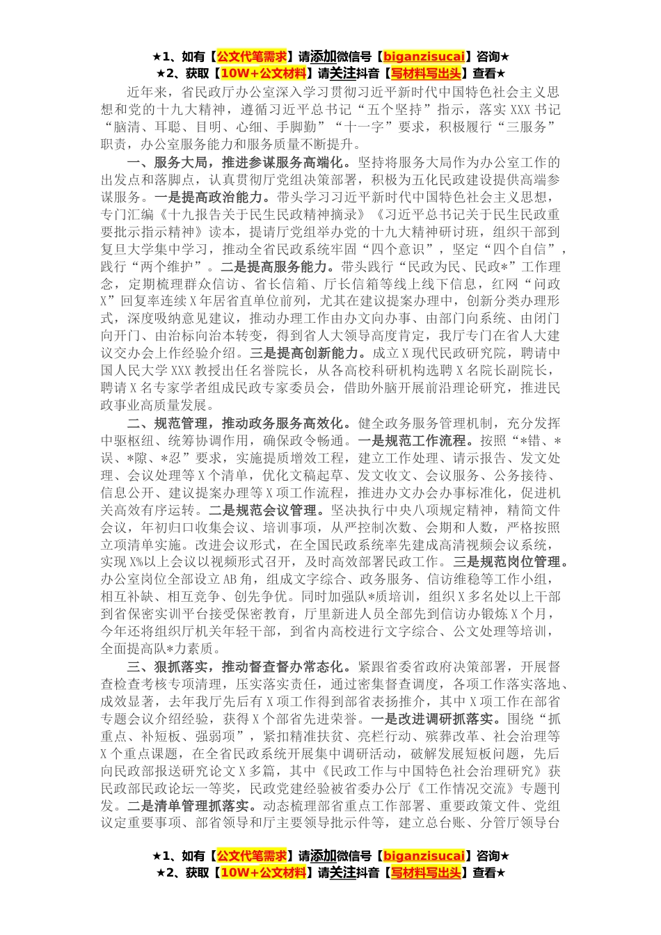 ★1、如有【公文代笔需求】请添加微信号【biganzisucai】咨询★★2、获取【10W+公文材料】请关注抖音【写材料写出头】查看★近年来,省民政厅办公室深入学习贯彻习近平新时代中国特色社会主义思想和党的十九大精神,遵循习近平总书记“五个坚持”指示,落实XXX书记“脑清、耳聪、目明、心细、手脚勤”“十一字”要求,积极履行“三服务”职责,办公室服务能力和服务质量不断提升。一、服务大局,推进参谋服务高端化。坚持将服务大局作为办公室工作的出发点和落脚点,认真贯彻厅党组决策部署,积极为五化民政建设提供高端参谋服务。一是提高政治能力。带头学习习近平新时代中国特色社会主义思想,专门汇编《十九报告关于民生民政精神摘录》《习近平总书记关于民生民政重要批示指示精神》读本,提请厅党组举办党的十...