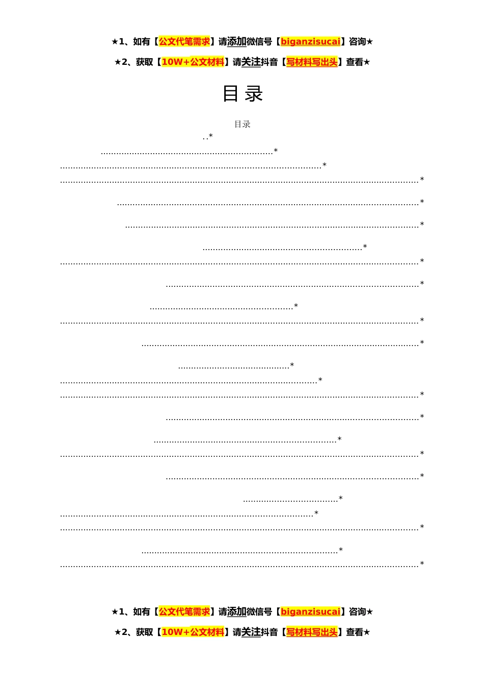 ★1、如有【公文代笔需求】请添加微信号【biganzisucai】咨询★★2、获取【10W+公文材料】请关注抖音【写材料写出头】查看★目录目录..*..................................................................*....................................................................................................*..........................................................................................................................................*....................................................................................................................*...................................................................................................................