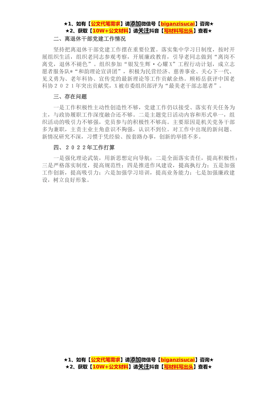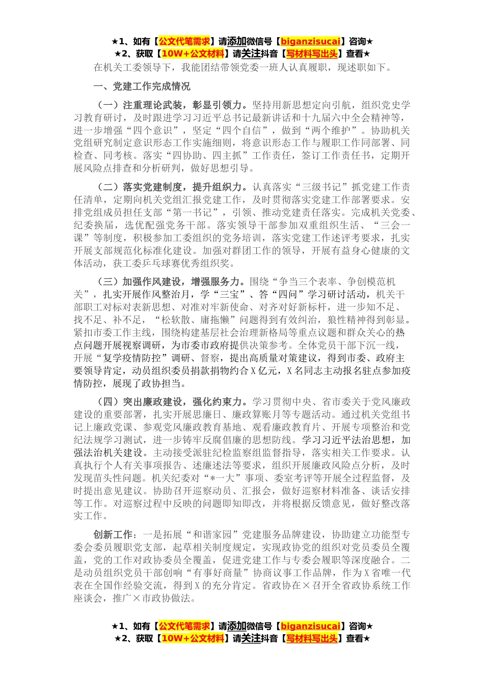 ★1、如有【公文代笔需求】请添加微信号【biganzisucai】咨询★★2、获取【10W+公文材料】请关注抖音【写材料写出头】查看★在机关工委领导下,我能团结带领党委一班人认真履职,现述职如下。一、党建工作完成情况(一)注重理论武装,彰显引领力。坚持用新思想定向引航,组织党史学习教育研讨,及时跟进学习习近平总书记最新讲话和十九届六中全会精神等,进一步增强“四个意识”,坚定“四个自信”,做到“两个维护”。协助机关党组研究制定意识形态工作实施细则,将意识形态工作与履职工作同部署、同检查、同考核。落实“四协助、四主抓”工作责任,签订工作责任书,定期开展风险点排查和分析研判,做好思想引导。(二)落实党建制度,提升组织力。认真落实“三级书记”抓党建工作责任清单,定期向机关党组汇报...