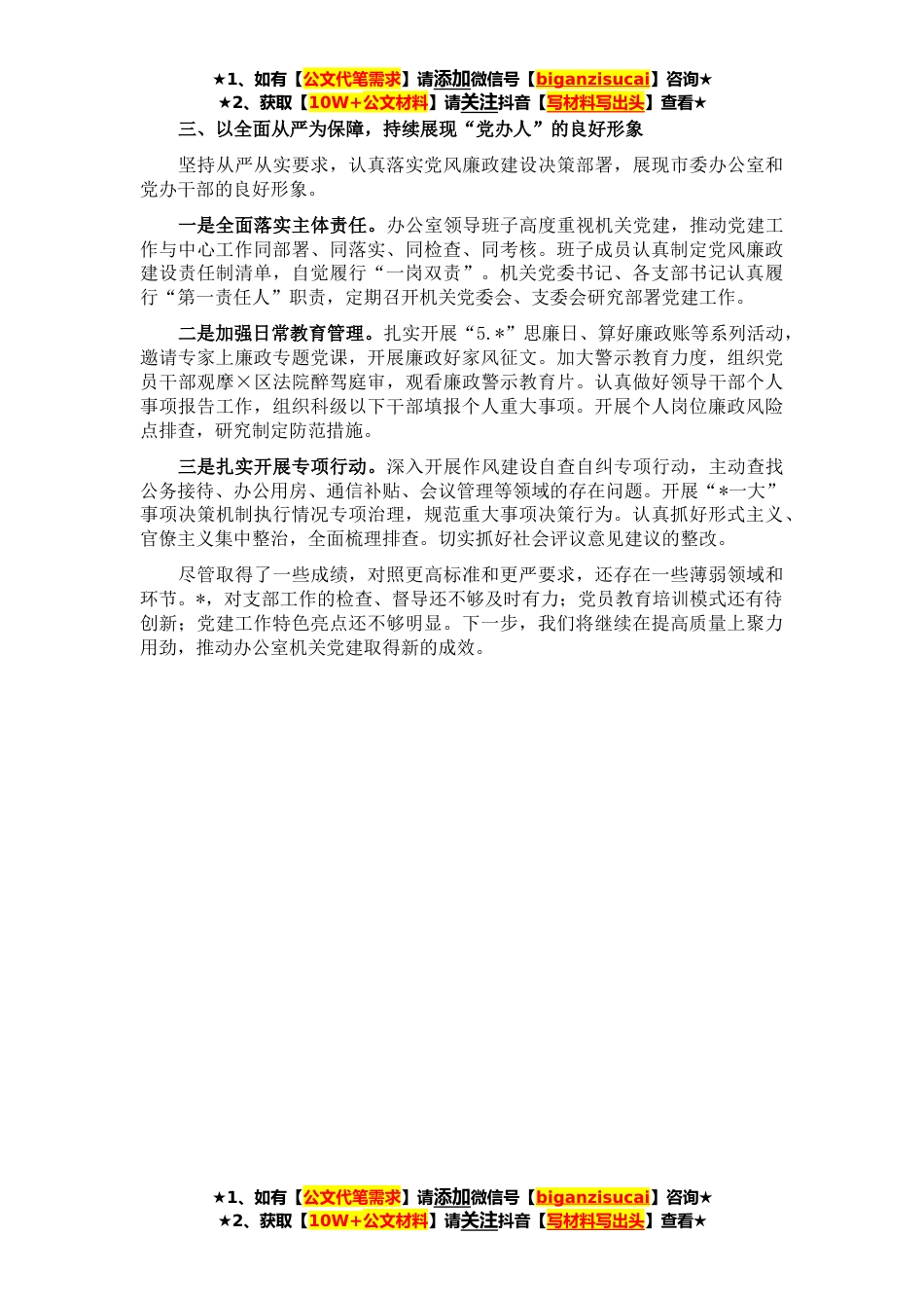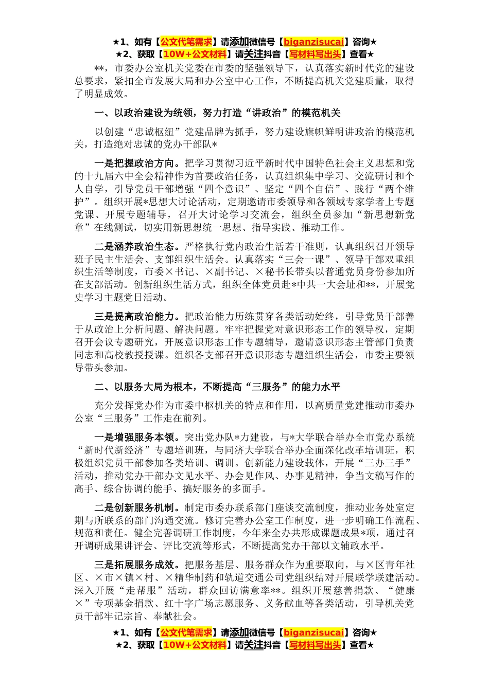 ★1、如有【公文代笔需求】请添加微信号【biganzisucai】咨询★★2、获取【10W+公文材料】请关注抖音【写材料写出头】查看★**,市委办公室机关党委在市委的坚强领导下,认真落实新时代党的建设总要求,紧扣全市发展大局和办公室中心工作,不断提高机关党建质量,取得了明显成效。一、以政治建设为统领,努力打造“讲政治”的模范机关以创建“忠诚枢纽”党建品牌为抓手,努力建设旗帜鲜明讲政治的模范机关,打造绝对忠诚的党办干部队*一是把握政治方向。把学习贯彻习近平新时代中国特色社会主义思想和党的十九届六中全会精神作为首要政治任务,认真组织集中学习、交流研讨和个人自学,引导党员干部增强“四个意识”、坚定“四个自信”、践行“两个维护”。组织开展*思想大讨论活动,定期邀请市委领导和各领域专家...