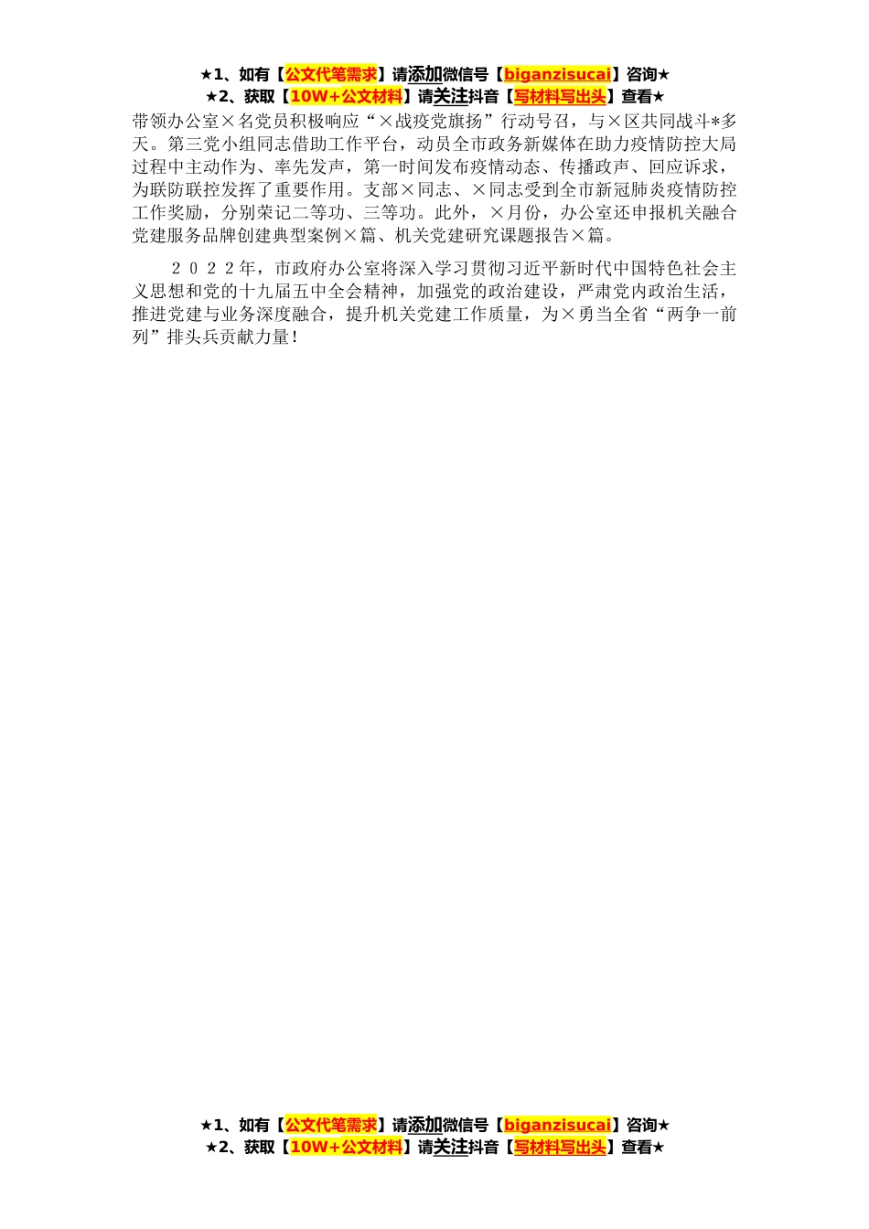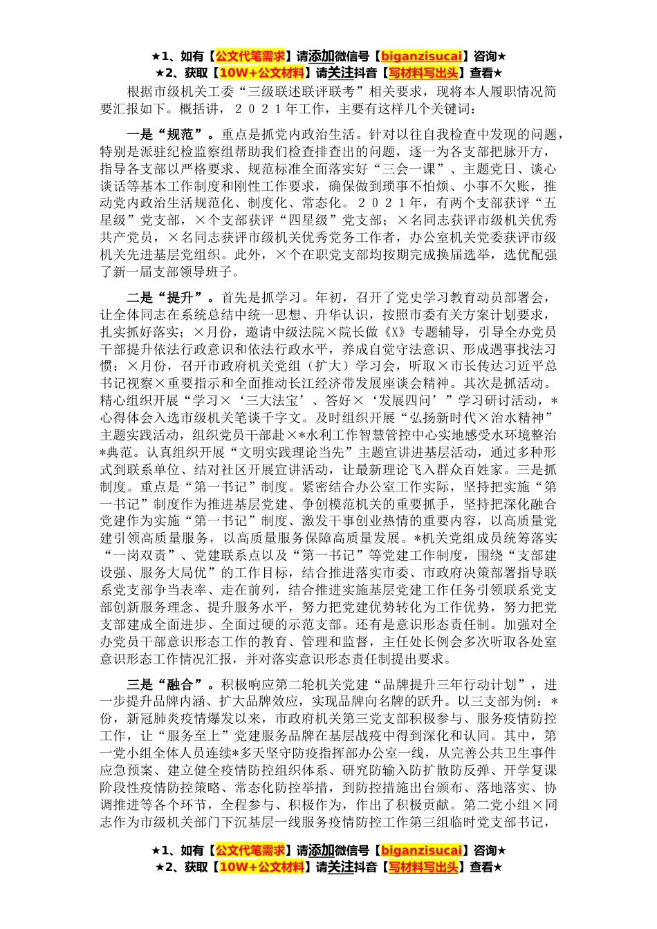 ★1、如有【公文代笔需求】请添加微信号【biganzisucai】咨询★★2、获取【10W+公文材料】请关注抖音【写材料写出头】查看★根据市级机关工委“三级联述联评联考”相关要求,现将本人履职情况简要汇报如下。概括讲,2021年工作,主要有这样几个关键词:一是“规范”。重点是抓党内政治生活。针对以往自我检查中发现的问题,特别是派驻纪检监察组帮助我们检查排查出的问题,逐一为各支部把脉开方,指导各支部以严格要求、规范标准全面落实好“三会一课”、主题党日、谈心谈话等基本工作制度和刚性工作要求,确保做到琐事不怕烦、小事不欠账,推动党内政治生活规范化、制度化、常态化。2021年,有两个支部获评“五星级”党支部,×个支部获评“四星级”党支部;×名同志获评市级机关优秀共产党员,×名同志...
