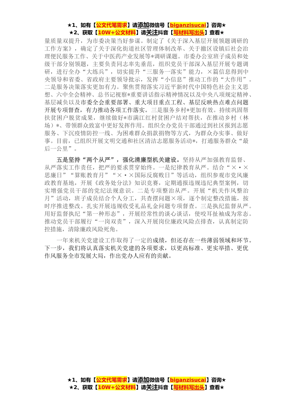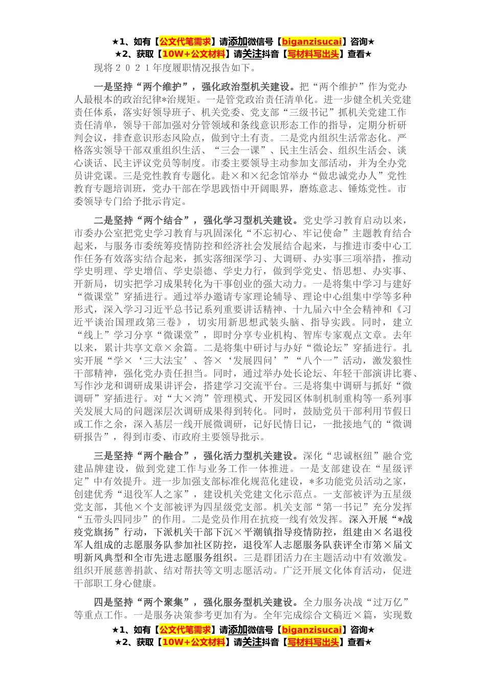 ★1、如有【公文代笔需求】请添加微信号【biganzisucai】咨询★★2、获取【10W+公文材料】请关注抖音【写材料写出头】查看★现将2021年度履职情况报告如下。一是坚持“两个维护”,强化政治型机关建设。把“两个维护”作为党办人最根本的政治纪律*治规矩。一是管党政治责任清单化。进一步健全机关党建责任体系,落实好领导班子、机关党委、党支部“三级书记”抓机关党建工作责任清单,领导干部加强对分管领域和条线意识形态工作的指导,定期分析研判会议,排查意识形态风险点,做到守土有责。二是党内组织生活常态化。严格落实领导干部双重组织生活、“三会一课”、民主生活会、组织生活会、谈心谈话、民主评议党员等制度。市委主要领导主动参加支部活动,并为全办党员讲党课。三是党性教育专题化。赴×和×纪...