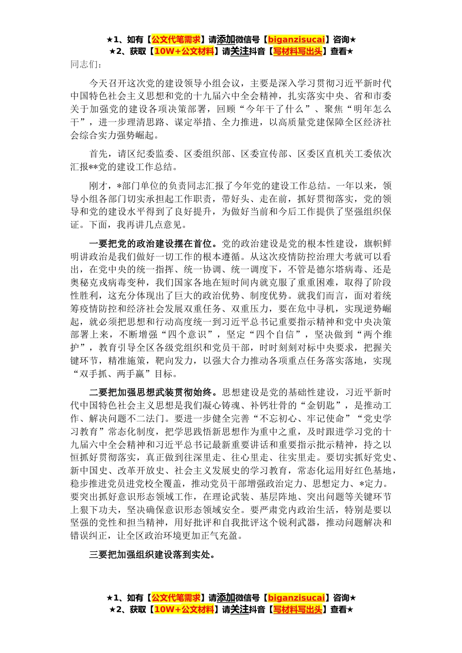 ★1、如有【公文代笔需求】请添加微信号【biganzisucai】咨询★★2、获取【10W+公文材料】请关注抖音【写材料写出头】查看★同志们:今天召开这次党的建设领导小组会议,主要是深入学习贯彻习近平新时代中国特色社会主义思想和党的十九届六中全会精神,扎实落实中央、省和市委关于加强党的建设各项决策部署,回顾“今年干了什么”、聚焦“明年怎么干”,进一步理清思路、谋定举措、全力推进,以高质量党建保障全区经济社会综合实力强势崛起。首先,请区纪委监委、区委组织部、区委宣传部、区委区直机关工委依次汇报**党的建设工作总结。刚才,*部门单位的负责同志汇报了今年党的建设工作总结。一年以来,领导小组各部门切实承担起工作职责,带好头、走在前,抓好贯彻落实,党的领导和党的建设水平得到了良好提升,...