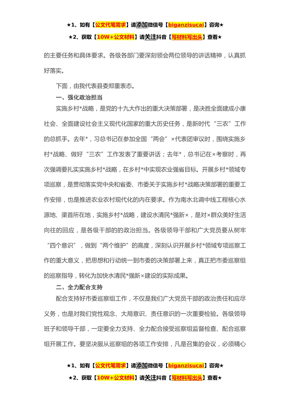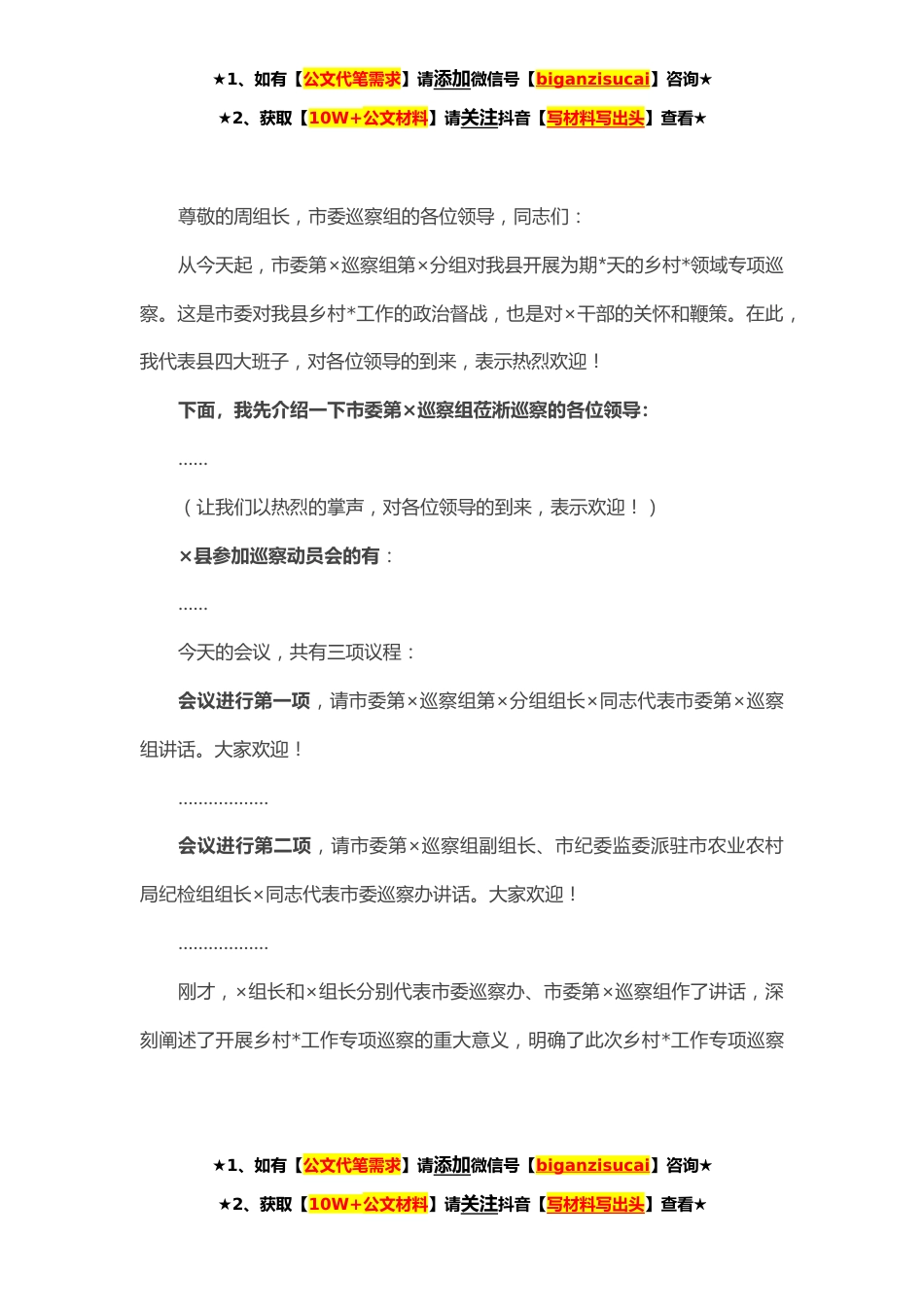 ★1、如有【公文代笔需求】请添加微信号【biganzisucai】咨询★★2、获取【10W+公文材料】请关注抖音【写材料写出头】查看★尊敬的周组长,市委巡察组的各位领导,同志们:从今天起,市委第×巡察组第×分组对我县开展为期*天的乡村*领域专项巡察。这是市委对我县乡村*工作的政治督战,也是对×干部的关怀和鞭策。在此,我代表县四大班子,对各位领导的到来,表示热烈欢迎!下面,我先介绍一下市委第×巡察组莅淅巡察的各位领导:……(让我们以热烈的掌声,对各位领导的到来,表示欢迎!)×县参加巡察动员会的有:……今天的会议,共有三项议程:会议进行第一项,请市委第×巡察组第×分组组长×同志代表市委第×巡察组讲话。大家欢迎!………………会议进行第二项,请市委第×巡察组副组长、市纪委监委派驻市农...