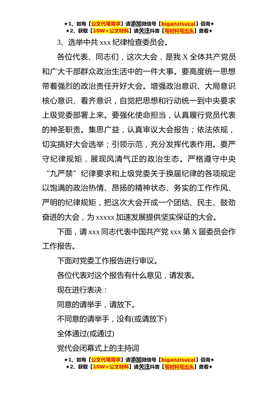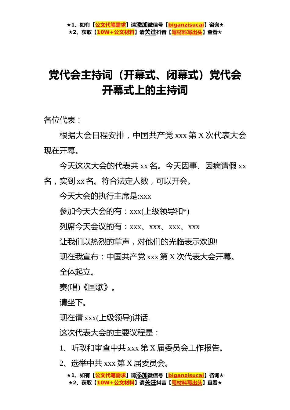 ★1、如有【公文代笔需求】请添加微信号【biganzisucai】咨询★★2、获取【10W+公文材料】请关注抖音【写材料写出头】查看★党代会主持词(开幕式、闭幕式)党代会开幕式上的主持词各位代表:根据大会日程安排,中国共产党xxx第X次代表大会现在开幕。今天这次大会的代表共xx名。今天因事、因病请假xx名,实到xx名。符合法定人数,可以开会。今天大会的执行主席是:xxx参加今天大会的有:xxx�(上级领导和*)列席今天会议的有:?xxx、xxx、xxx、xxx让我们以热烈的掌声,对他们的光临表示欢迎!现在我宣布:中国共产党xxx第X次代表大会开幕。全体起立。奏(唱)《国歌》。请坐下。现在请xxx�(上级领导)�讲话.这次代表大会的主要议程是:1、?听取和审查中共xxx第X届委员会工作报告。2、?选举中共xxx第X届委员会。★1、如...
