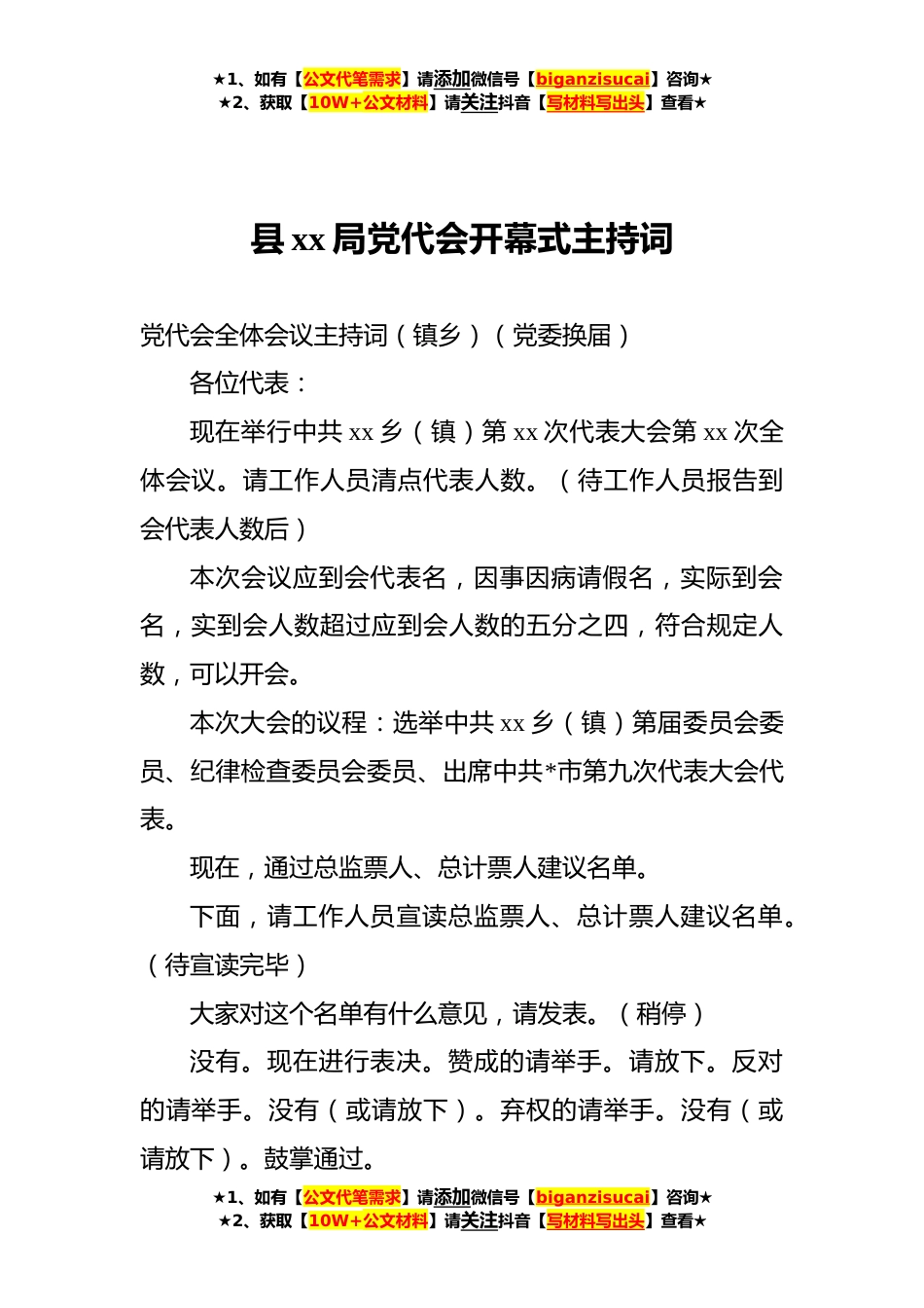 ★1、如有【公文代笔需求】请添加微信号【biganzisucai】咨询★★2、获取【10W+公文材料】请关注抖音【写材料写出头】查看★县xx局党代会开幕式主持词党代会全体会议主持词(镇乡)(党委换届)各位代表:现在举行中共xx乡(镇)第xx次代表大会第xx次全体会议。请工作人员清点代表人数。(待工作人员报告到会代表人数后)本次会议应到会代表名,因事因病请假名,实际到会名,实到会人数超过应到会人数的五分之四,符合规定人数,可以开会。本次大会的议程:选举中共xx乡(镇)第届委员会委员、纪律检查委员会委员、出席中共*市第九次代表大会代表。现在,通过总监票人、总计票人建议名单。下面,请工作人员宣读总监票人、总计票人建议名单。(待宣读完毕)大家对这个名单有什么意见,请发表。(稍停)没有。现在进...