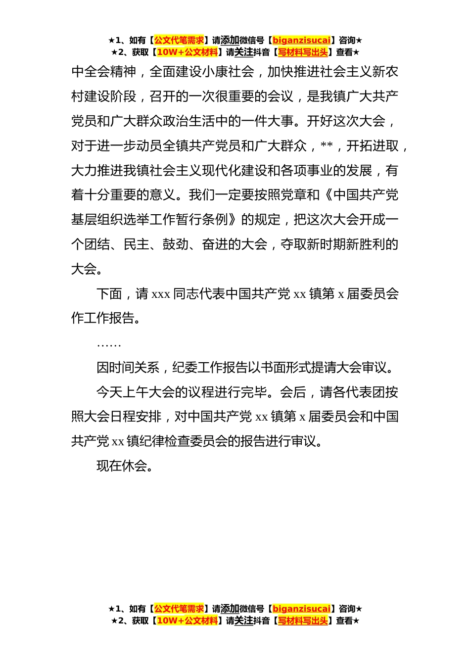 ★1、如有【公文代笔需求】请添加微信号【biganzisucai】咨询★★2、获取【10W+公文材料】请关注抖音【写材料写出头】查看★党代会开幕式主持词(镇乡)各位代表:根据大会日程安排,中国共产党xx镇第x次党员代表大会,现在举行开幕式。这次大会的代表共xxx名。因事、因病请假xx名,实到xxx名。符合法定人数,可以开会。今天大会的执行主席是:xxx、xxx、xxx……列席今天会议的有:……现在我宣布中国共产党xx镇第x次党员代表大会开幕(鼓掌)。全体起立。奏国歌。请坐下。这次大会的议程是:1、听取和审查中共xx镇第x届委员会工作报告。2、听取和审查中共xx镇纪律检查委员会工作报告。3、选举中共xx镇第x届委员会。4、选举中共xx镇纪律检查委员会。各位代表、同志们,这次会议是在全镇广大党员干部认真贯彻落实党...