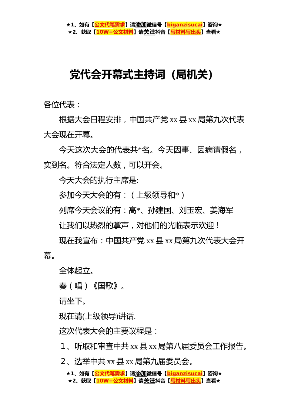 ★1、如有【公文代笔需求】请添加微信号【biganzisucai】咨询★★2、获取【10W+公文材料】请关注抖音【写材料写出头】查看★党代会开幕式主持词(局机关)各位代表:根据大会日程安排,中国共产党xx县xx局第九次代表大会现在开幕。今天这次大会的代表共*名。今天因事、因病请假名,实到名。符合法定人数,可以开会。今天大会的执行主席是:参加今天大会的有:(上级领导和*)列席今天会议的有:高*、孙建国、刘玉宏、姜海军让我们以热烈的掌声,对他们的光临表示欢迎!现在我宣布:中国共产党xx县xx局第九次代表大会开幕。全体起立。奏(唱)《国歌》。请坐下。现在请(上级领导)讲话.这次代表大会的主要议程是:1、听取和审查中共xx县xx局第八届委员会工作报告。2、选举中共xx县xx局第九届委员会。★1、如有【公...