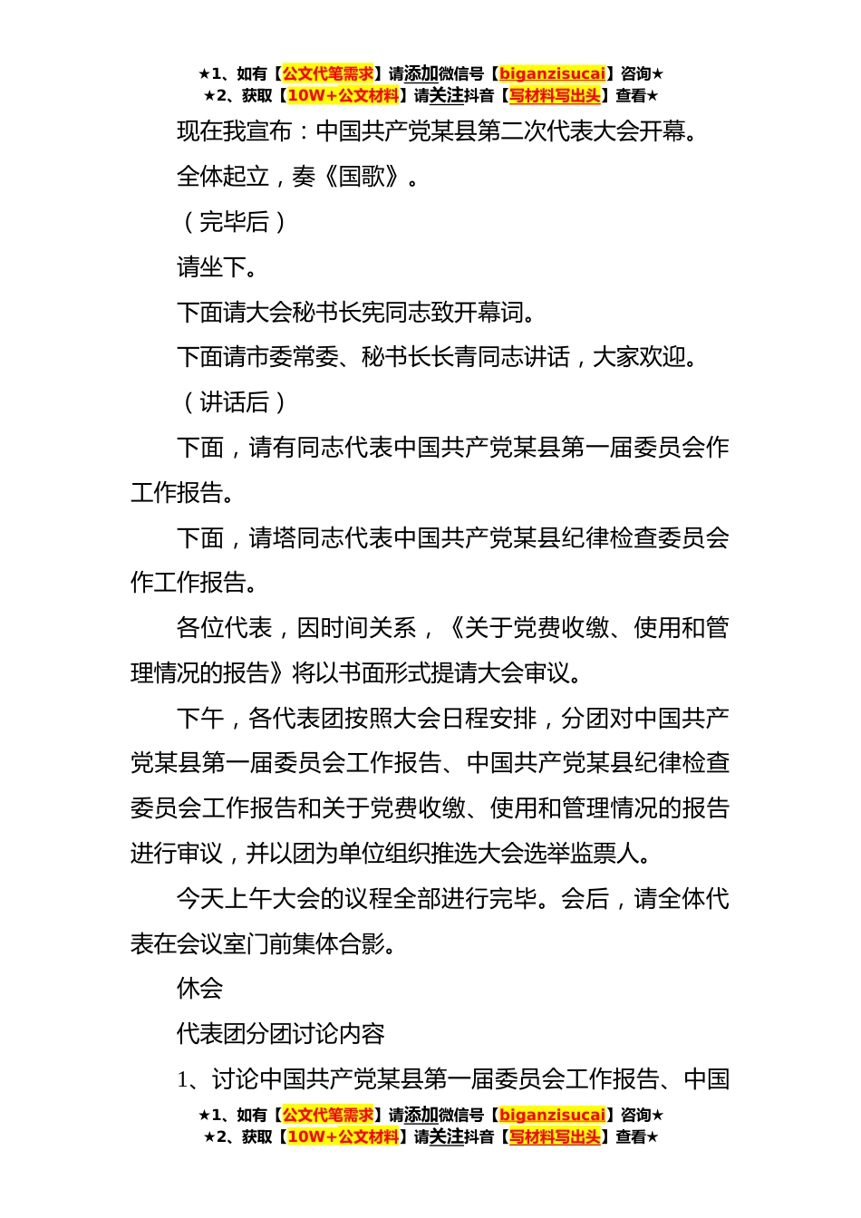 ★1、如有【公文代笔需求】请添加微信号【biganzisucai】咨询★★2、获取【10W+公文材料】请关注抖音【写材料写出头】查看★党代会开幕式主持词各位代表:根据大会日程安排,中国共产党某县第二次代表大会,今天举行开幕式。这次大会应到代表xx名,实到xx名,因事、因病请假名,符合法定人数,可以开会。参加今天大会的上级领导有:市委常委、秘书长郭长青,市委组织部副处级组织员、县区干部科科长姬庞林,市委组织部正科级组织员郜培法。列席今天大会的有:曾担任县级领导职务的党内老同志,非本次党代会代表的省、市党代表会代表,不是代表的县直各机关、企事业单位党员负责同志,不是代表的县人大、县政协各工作委员会的党员负责同志,不是代表的垂直管理单位的党员负责同志,县级领导班子中的党外人士和各民...