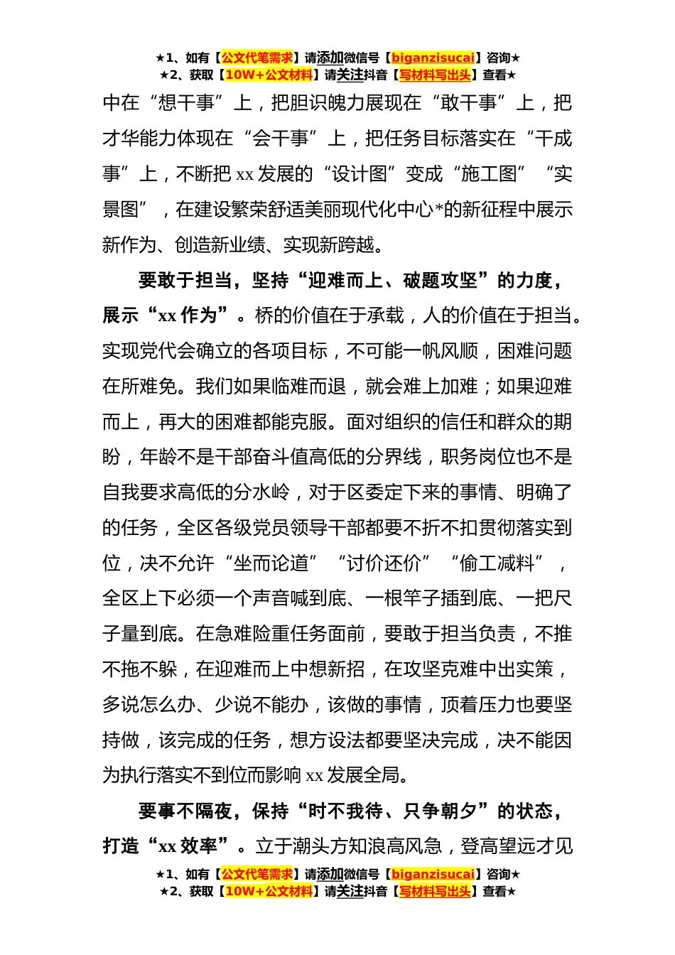 ★1、如有【公文代笔需求】请添加微信号【biganzisucai】咨询★★2、获取【10W+公文材料】请关注抖音【写材料写出头】查看★区委书记在党代会闭幕式上的主持讲话各位代表、同志们:中国共产党xx市xx区第十一次代表大会在大家的共同努力下,圆满完成了各项议程,即将胜利闭幕。这次会议是在“两个一百年”奋斗目标历史交汇点上召开的一次重要会议。会议以“乘势而上开新局,接续奋斗启新程,为开创新时代xx高质量发展崭新篇章矢志奋斗”为主题,回顾了xx过去五年砥砺奋进、攻坚克难取得的显著成绩,科学客观分析了在开启建设社会主义现代化新的历史进程中我们面临的内外部机遇和挑战,擘画了未来五年发展蓝图会议期间,各位与会代表全身心投入会议,集思广益,畅所欲言,建言献策,充分体现了大家的“主人翁”意识...
