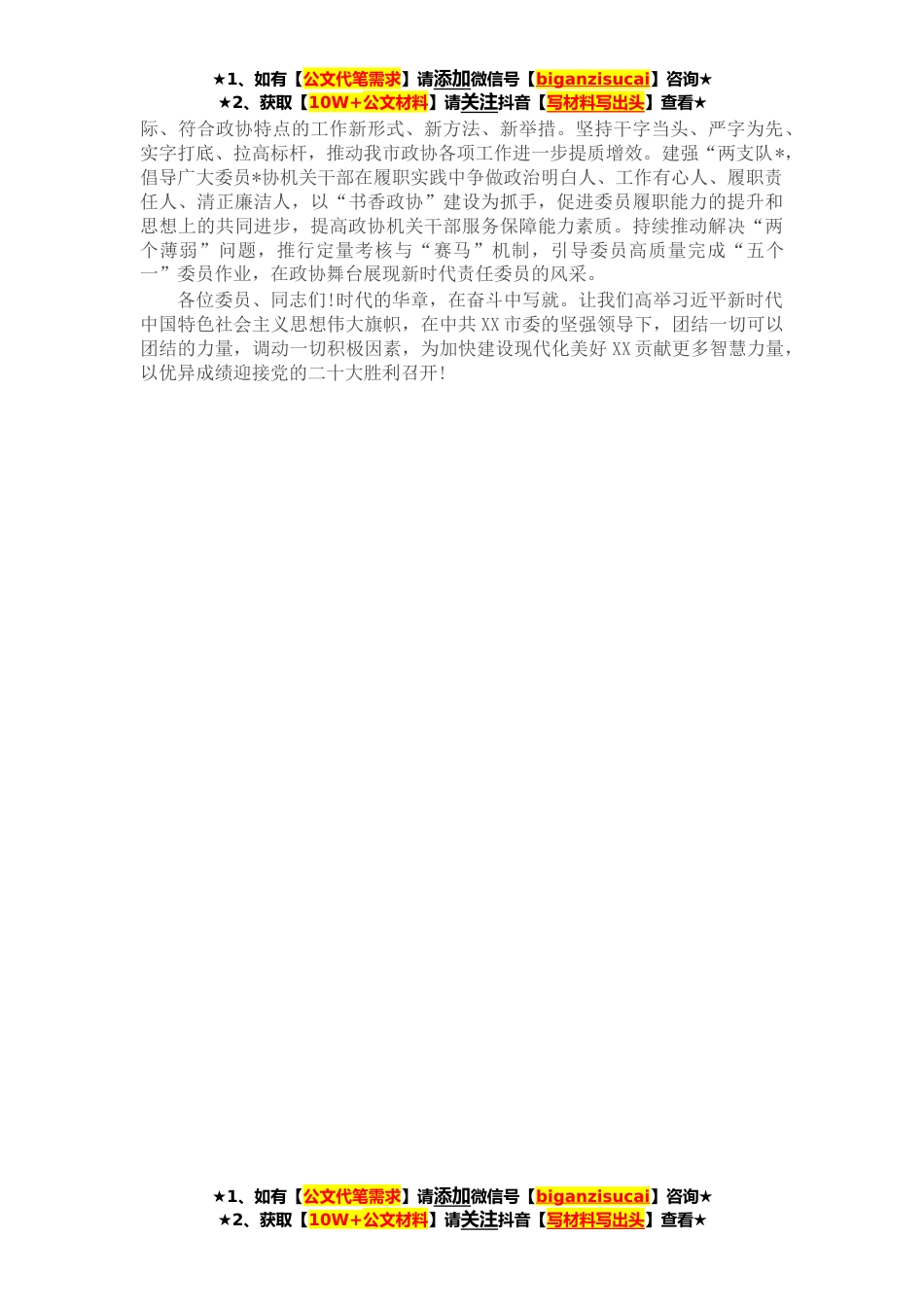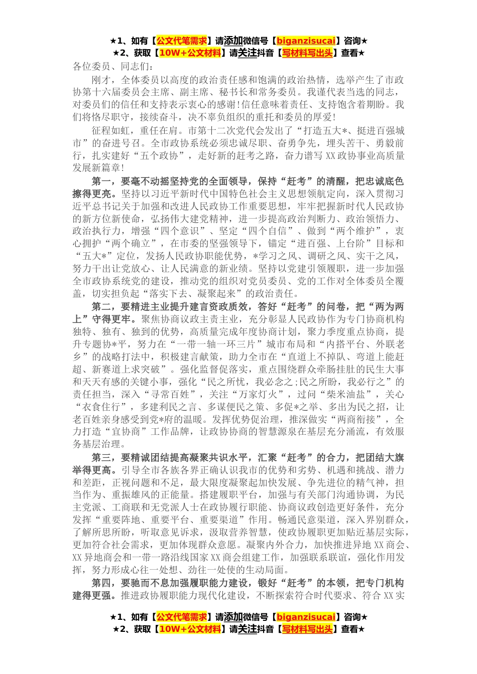 ★1、如有【公文代笔需求】请添加微信号【biganzisucai】咨询★★2、获取【10W+公文材料】请关注抖音【写材料写出头】查看★各位委员、同志们:刚才,全体委员以高度的政治责任感和饱满的政治热情,选举产生了市政协第十六届委员会主席、副主席、秘书长和常务委员。我谨代表当选的同志,对委员们的信任和支持表示衷心的感谢!信任意味着责任、支持饱含着期盼。我们将恪尽职守,接续奋斗,决不辜负组织的重托和委员的厚爱!征程如虹,重任在肩。市第十二次党代会发出了“打造五大*、挺进百强城市”的奋进号召。全市政协系统必须忠诚尽职、奋勇争先,埋头苦干、勇毅前行,扎实建好“五个政协”,走好新的赶考之路,奋力谱写XX政协事业高质量发展新篇章!第一,要毫不动摇坚持党的全面领导,保持“赶考”的清醒,把忠诚...