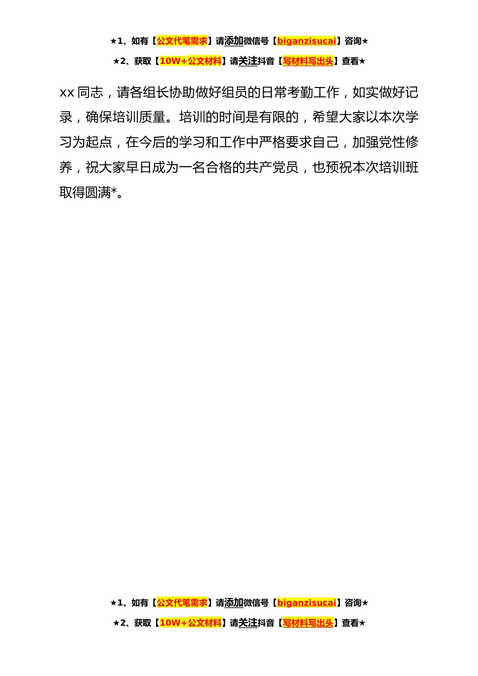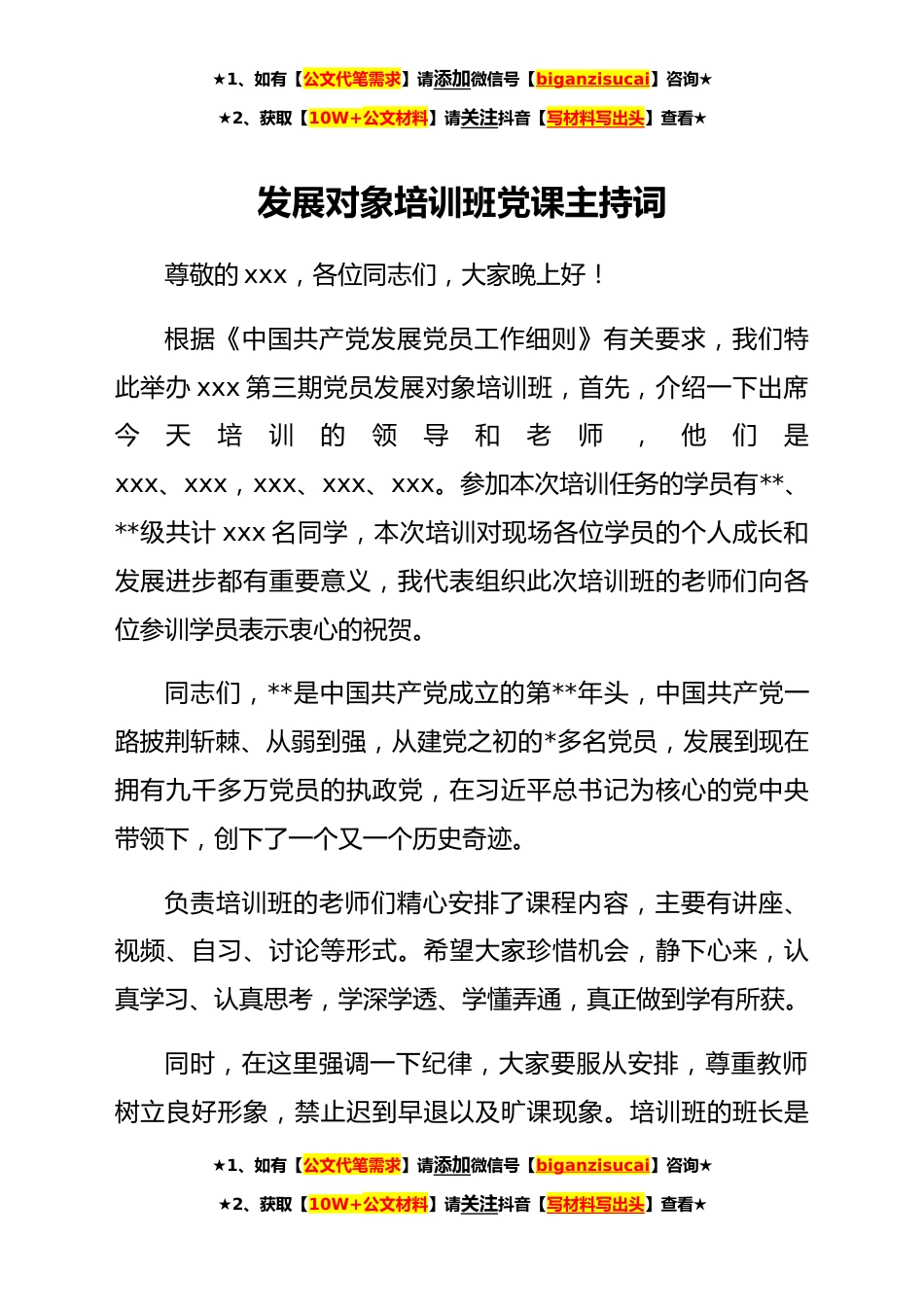 ★1、如有【公文代笔需求】请添加微信号【biganzisucai】咨询★★2、获取【10W+公文材料】请关注抖音【写材料写出头】查看★发展对象培训班党课主持词尊敬的xxx,各位同志们,大家晚上好!根据《中国共产党发展党员工作细则》有关要求,我们特此举办xxx第三期党员发展对象培训班,首先,介绍一下出席今天培训的领导和老师,他们是xxx、xxx,xxx、xxx、xxx。参加本次培训任务的学员有**、**级共计xxx名同学,本次培训对现场各位学员的个人成长和发展进步都有重要意义,我代表组织此次培训班的老师们向各位参训学员表示衷心的祝贺。同志们,**是中国共产党成立的第**年头,中国共产党一路披荆斩棘、从弱到强,从建党之初的*多名党员,发展到现在拥有九千多万党员的执政党,在习近平总书记为核心的党中央带领下,创下...