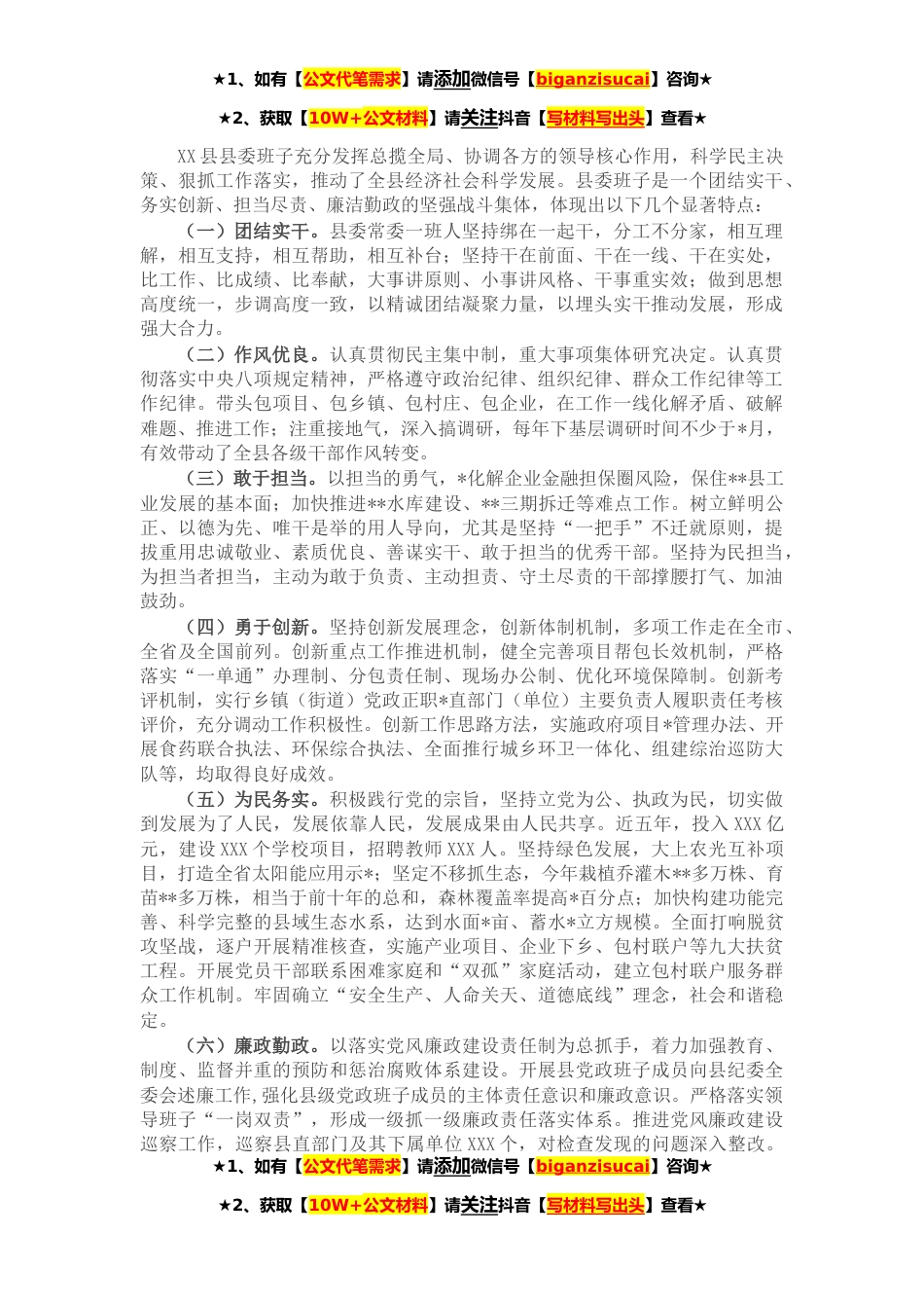 ★1、如有【公文代笔需求】请添加微信号【biganzisucai】咨询★★2、获取【10W+公文材料】请关注抖音【写材料写出头】查看★XX县县委班子充分发挥总揽全局、协调各方的领导核心作用,科学民主决策、狠抓工作落实,推动了全县经济社会科学发展。县委班子是一个团结实干、务实创新、担当尽责、廉洁勤政的坚强战斗集体,体现出以下几个显著特点:(一)团结实干。县委常委一班人坚持绑在一起干,分工不分家,相互理解,相互支持,相互帮助,相互补台;坚持干在前面、干在一线、干在实处,比工作、比成绩、比奉献,大事讲原则、小事讲风格、干事重实效;做到思想高度统一,步调高度一致,以精诚团结凝聚力量,以埋头实干推动发展,形成强大合力。(二)作风优良。认真贯彻民主集中制,重大事项集体研究决定。认真贯彻...