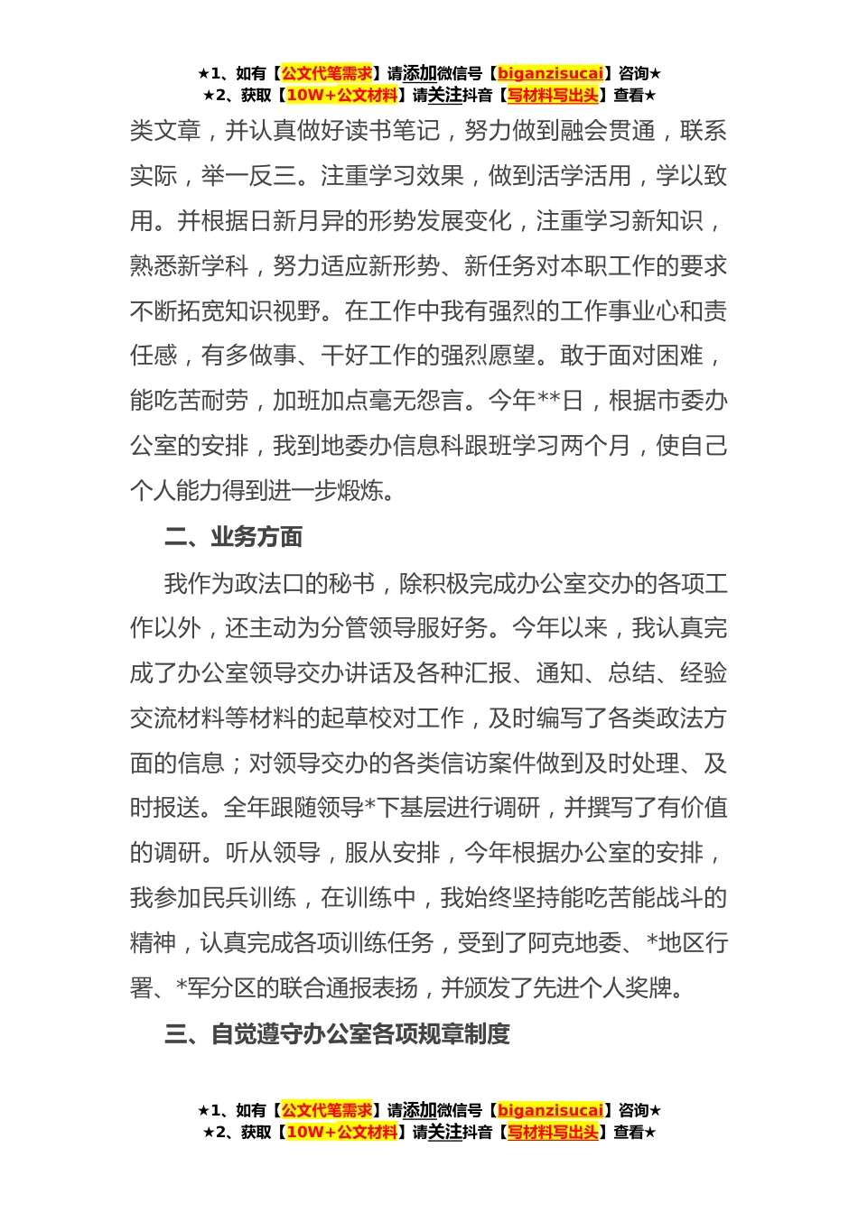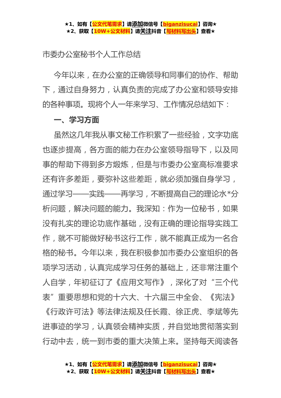 ★1、如有【公文代笔需求】请添加微信号【biganzisucai】咨询★★2、获取【10W+公文材料】请关注抖音【写材料写出头】查看★市委办公室秘书个人工作总结今年以来,在办公室的正确领导和同事们的协作、帮助下,通过自身努力,认真负责的完成了办公室和领导安排的各种事项。现将个人一年来学习、工作情况总结如下:一、学习方面虽然这几年我从事文秘工作积累了一些经验,文字功底也逐步提高,各方面的能力在办公室领导指导下,以及同事的帮助下得到多方煅炼,但是与市委办公室高标准要求还有许多差距,要弥补这些差距,就必须加强自身学习,通过学习——实践——再学习,不断提高自己的理论水*分析问题,解决问题的能力。我深知:作为一位秘书,如果没有扎实的理论功底作基础,没有正确的理论指导实践工作,就不可能...