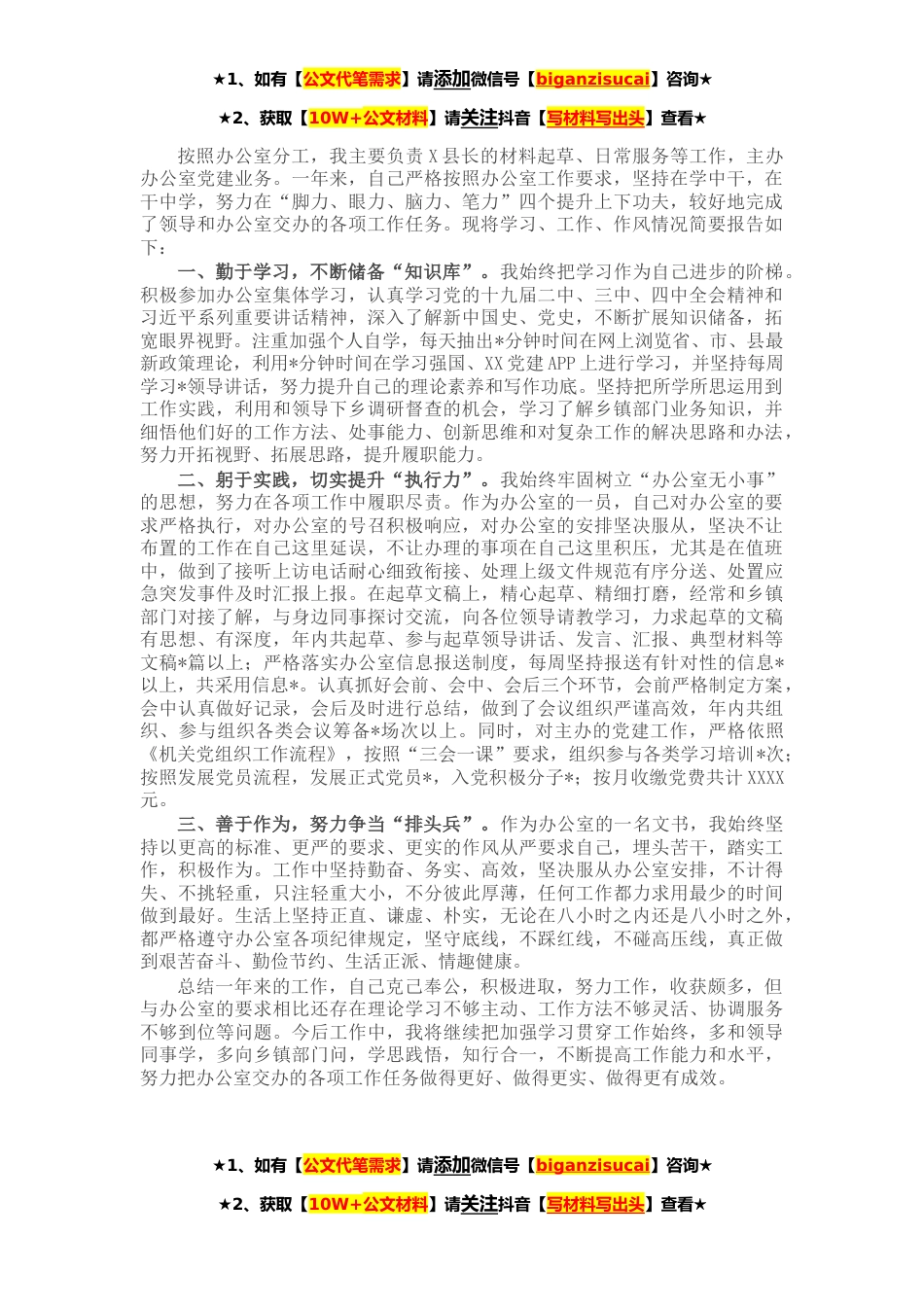 ★1、如有【公文代笔需求】请添加微信号【biganzisucai】咨询★★2、获取【10W+公文材料】请关注抖音【写材料写出头】查看★按照办公室分工,我主要负责X县长的材料起草、日常服务等工作,主办办公室党建业务。一年来,自己严格按照办公室工作要求,坚持在学中干,在干中学,努力在“脚力、眼力、脑力、笔力”四个提升上下功夫,较好地完成了领导和办公室交办的各项工作任务。现将学习、工作、作风情况简要报告如下:一、勤于学习,不断储备“知识库”。我始终把学习作为自己进步的阶梯。积极参加办公室集体学习,认真学习党的十九届二中、三中、四中全会精神和习近平系列重要讲话精神,深入了解新中国史、党史,不断扩展知识储备,拓宽眼界视野。注重加强个人自学,每天抽出*分钟时间在网上浏览省、市、县最新政...
