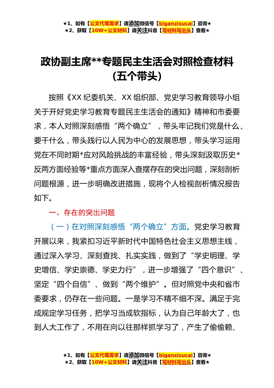 ★1、如有【公文代笔需求】请添加微信号【biganzisucai】咨询★★2、获取【10W+公文材料】请关注抖音【写材料写出头】查看★政协副主席**专题民主生活会对照检查材料(五个带头)按照《XX纪委机关、XX组织部、党史学习教育领导小组关于开好党史学习教育专题民主生活会的通知》精神和市委要求,本人对照深刻感悟“两个确立”,带头牢记我们党是什么、要干什么,带头践行以人民为中心的发展思想,带头学习运用党在不同时期*应对风险挑战的丰富经验,带头深刻汲取历史*反两方面经验等*重点方面深入查摆存在的突出问题,深刻剖析问题根源,进一步明确改进措施,现将个人检视剖析情况报告如下。一、存在的突出问题(一)在对照深刻感悟“两个确立”方面。党史学习教育开展以来,我紧扣习近平新时代中国特色社会主义思想...