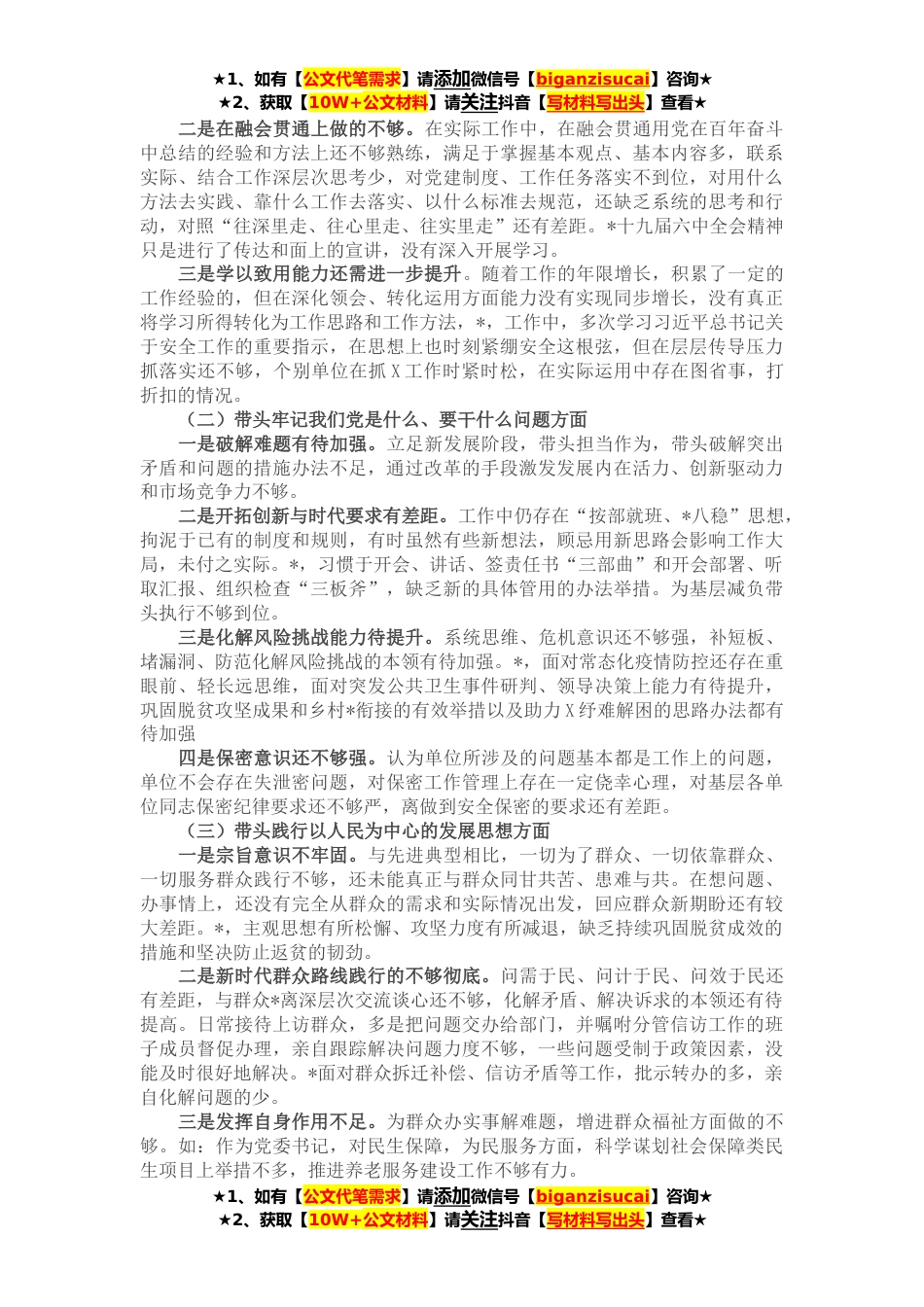 ★1、如有【公文代笔需求】请添加微信号【biganzisucai】咨询★★2、获取【10W+公文材料】请关注抖音【写材料写出头】查看★根据X《关于认真开好党史学习教育专题民主生活会的通知》要求,会前,我紧扣这次会议主题,以理论中心组和个人自学相结合的方式,对照“学史明理、学史增信、学史崇德、学史力行”和“学党史、悟思想、办实事、开新局”的目标要求,在广泛征求意见,认真开展谈心谈话和深入基层开展调查研究的基础上,充分发挥党委书记带头表率作用。对照“五个带头”,查找自身存在的差距和不足,深刻剖析了问题产生的原因,明确了今后努力方向和整改措施。现将个人对照检查情况报告如下:一、思想认识党的十九届六中全会审议通过的《决议》,开创性提出“两个确立”,即确立习近平同志党中央的核心、全党...